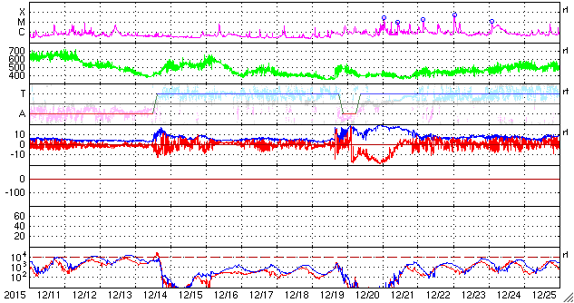 下段のAEグラフの値が高くなると、オーロラ活動が活発化しています。
