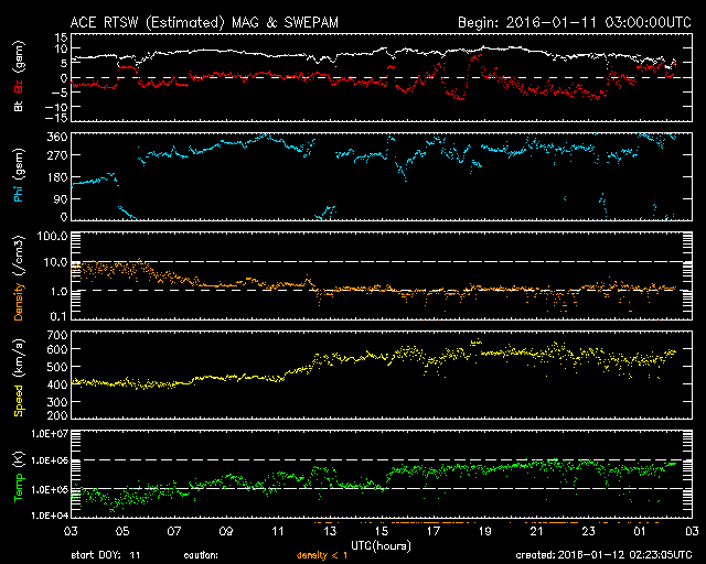 2016/ 1/ 8 11:32 500km/秒台中盤の高速太陽風が続いています。磁気圏もやや活動的です。