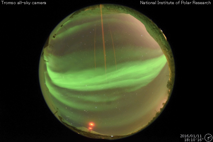 ノルウェー・トロムソの全天カメラにより撮影された、世界時11日18〜19時頃のオーロラ。