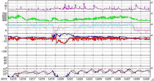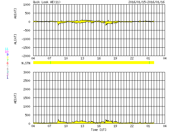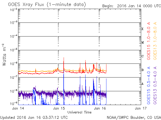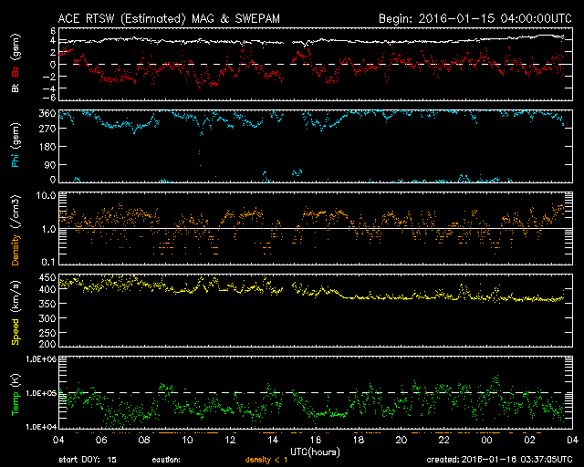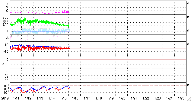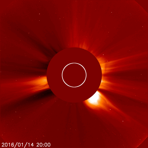 2016/ 1/16 12:38 更新 淡いCMEが発生しています。太陽風は低速になり、磁気圏も概ね静穏です。 担当 篠原 昨日のフィラメント噴出により、 淡いCME(太陽ガスの放出現象)が発生しています。 SOHO衛星LASCO C2の動画を掲載しますが、 世界時で14日から15日に変わる頃に、 淡いガスが広がっていく様子を見つけることができます。 CMEは、太陽の右側を広く囲むように広がっていて、 地球方向にも向かっている可能性があります。 19日頃に太陽風の弱い乱れがやって来るかもしれません。 太陽では、西側(右側)の2480黒点群で、 C1の小さいフレアが3回と、 Bクラスのフレアも繰り返し発生しています。 X線のグラフは、変化が目立っていますが、 今のところ、規模が大きくなる様子はなく、 2480群は、このまま西の端に近付いていきそうです。 太陽風は、420km/秒から360km/秒へ下がり、 低速の風に変わっています。 磁場強度は、5nTと平均的な状態です。 磁場の南北成分は、0nT付近で小さく変化しています。 AE指数は、小さい変化が見られる程度で、 磁気圏は概ね静穏です。 SDO衛星AIA193の太陽写真は、 南東側(左下)の高緯度域にコロナホールが見える程度で、 太陽風は穏やかに推移しそうです。