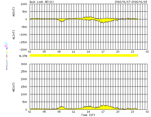 このため、AE指数は、200〜300nTと小さい変化ですが、