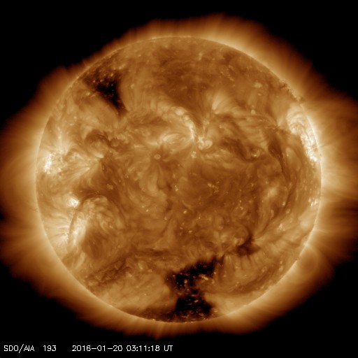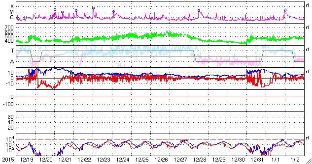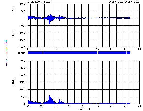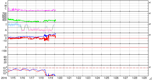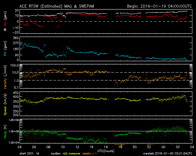2016/ 1/20 12:23 更新 太陽風は、磁場の強まった状態が続いています。磁気圏は静かです。 担当 篠原 太陽風は、磁場の強まった状態が続いています。 昨日のニュースの頃、10nTに高まっていた磁場強度は、 夜に入るともう一段強まって、15nTになりました。 磁場の南北成分は、それまでは南北両方に振れていたのですが、 磁場が一段強まった以降は北向きになり、 +10nT前後と強まった状態で推移しています。 太陽風の速度は、磁場の強まりとともに、 350km/秒から380km/秒へ少し上がっています。 磁場が完全に北を向いたので、 磁気圏はとても静かになっています。 AE指数のグラフは、途中から全く変化がなくなっています。 磁場が北向きでなく、南向きに振れていれば、 磁気圏へエネルギーが流れ込んで、 オーロラの活動も高まっていたでしょう。 オーロラ観望の視点では、残念な変化になりました。 太陽風のグラフの最後では、 磁場、速度ともに少し上がる変化も見えています。 この後も、どのような推移をするのか注目してください。 太陽は、特にフレアの発生はなく、穏やかです。 SDO衛星AIA193の太陽写真では、 北東の端(左上)からコロナホールが現れています。 ![]() SDO衛星のAIA193カメラによる太陽コロナの様子 (c) SDO (NASA) ![]() SDO衛星による太陽の可視光写真。マウスの矢印を写真に重ねると、黒点番号付きの写真に切り替わります。 (c) SDO (NASA) ![]() ACEが観測した太陽風の磁場(1番上の枠、白線は全体の強度、赤線は南北成分) および、太陽風の密度(3番目の橙線)、速度(4番目の黄線) (c) NOAA/SWPC ![]() リアルタイムAE指数 下段のAEグラフの値が高くなると、オーロラ活動が活発化しています。 (c) 京都大学, NICT ![]() 27日の太陽周期に合わせたデータプロット 太陽が同じ面を地球に向けていた27日前の変化から、今後を予想することができます。 (c) 作図:宇宙天気ニュース