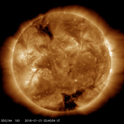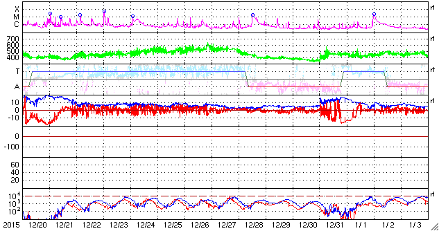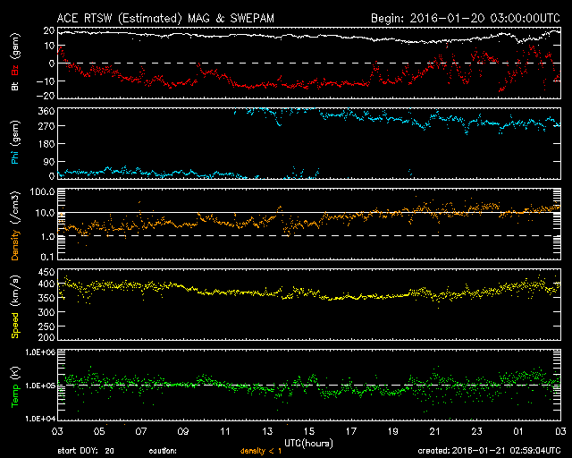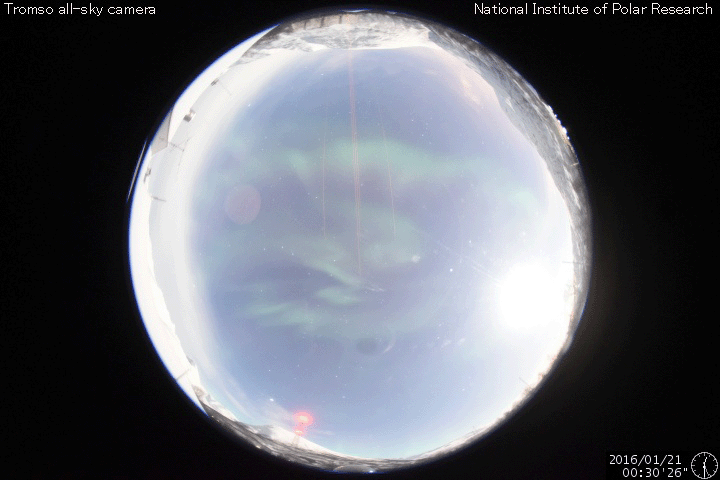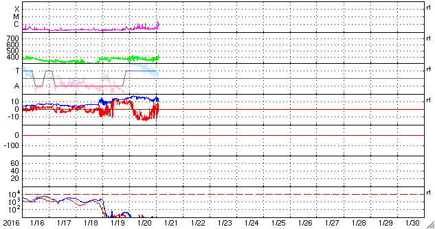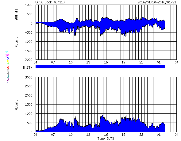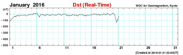 2016/ 1/21 12:00 更新 太陽風磁場が南向きに大きく変化し、磁気嵐が発生しています。 担当 篠原 太陽風の磁場は、強まった状態が続いていて、 昨日から今日にかけて、15nT前後で推移しています。 磁場の南北成分は、昨日のニュースの後に南向きに切り替わり、 -10nT前後の強い南向きが半日にわたって続きました。 27日周期の図で、太陽風の乱れの全体を見ることができますが、 CMEによる磁場の大きな変化が到来しているようです。 太陽風の速度は、 380〜400km/秒と平均的な状態で安定しています 磁場が南向きに強まった影響で、磁気圏の活動も高まっています。 AE指数は、800nT程度の中規模の変化が一日にわたって続いています。 このグラフでは特に大きな変化ではありませんが、 世界時21日0〜1時頃のオーロラの様子を、 トロムソの全天カメラの動画で紹介します。 月が明るいため、空の条件は良くありませんが、 明るいオーロラが乱舞しています。 また、京都大学WDCのDst指数(速報値)では、 変化は最大で -132nTに達していて、 やや大きい磁気嵐になっています。 現在の太陽風は、磁場強度は高まったままですが、 南北成分が南北に大きく変化するようになっています。 CMEによる変化は終わりに近付いていると思いますが、 引き続き変化に注目して下さい。 太陽は、東側(左側)の2487黒点群で、 C1.3、C2.9の小規模フレアが発生しています。 左上の2488群とともに、黒点が大きくなっています。 今後の変化に注目して下さい。