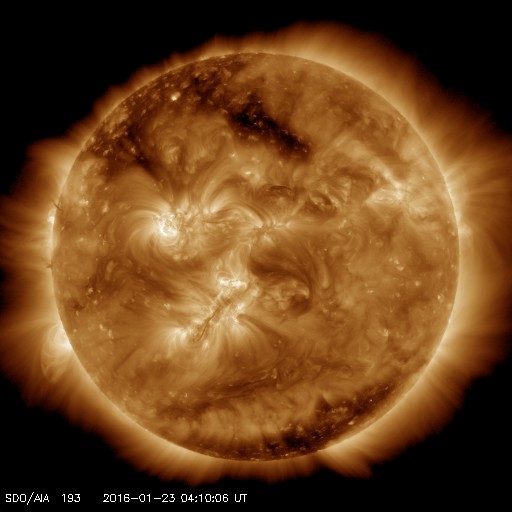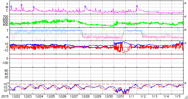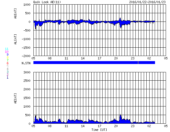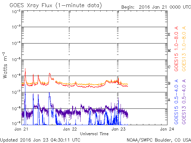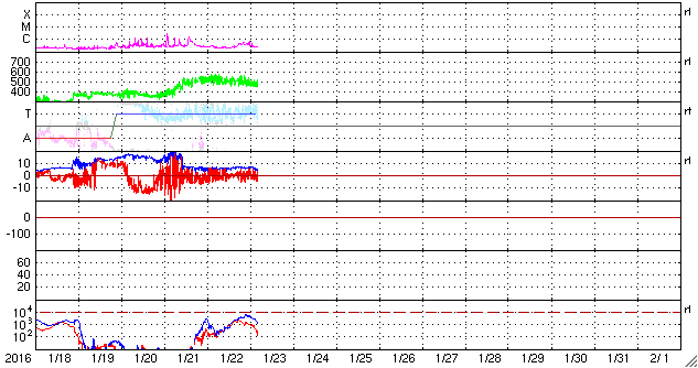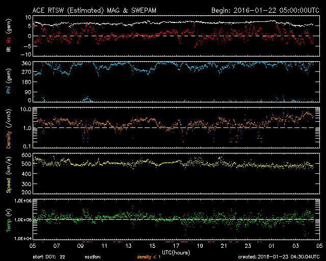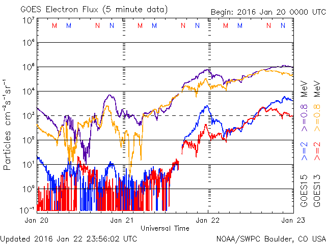 2016/ 1/23 13:30 更新 太陽風はやや高速です。磁気圏の活動は小さくなっています。 担当 篠原 太陽風の速度は、昨日の午後に500km/秒を割りましたが、 現在も480km/秒とやや高速の状態が続いています。 磁場強度は、5〜6nTと平均的な状態で安定してます。 太陽風磁場の南北成分は、0nT付近で小さく変化しています。 このため、磁気圏の活動は弱まって、 AE指数の変化は200nT前後と小規模になりましたが、 一日を通して変化が続いています。 太陽風の高まりは、弱まり始めています。 27日周期の図の前周期のグラフと 同様の推移をするのかもしれません。 太陽は、目立ったフレアの発生はなくなり、 静かになっています。 南半球側の2486黒点群、2487黒点群は、 黒点も小さくなっているようです。 放射線帯の高エネルギー電子が増加しています。 更に高まって、10,000の線に達するでしょうか。
