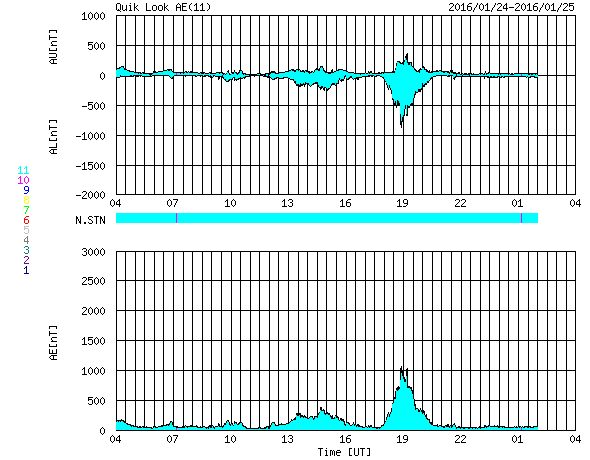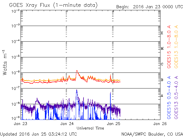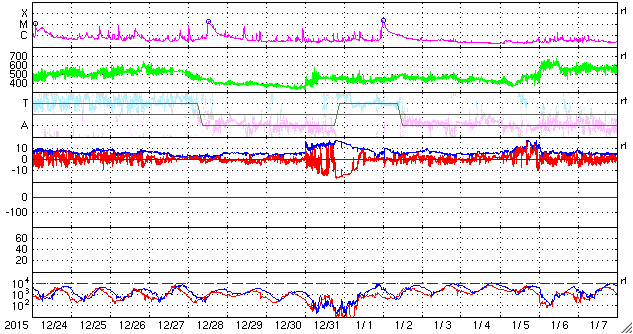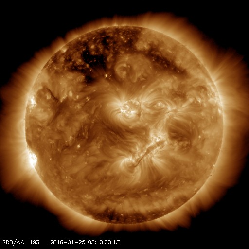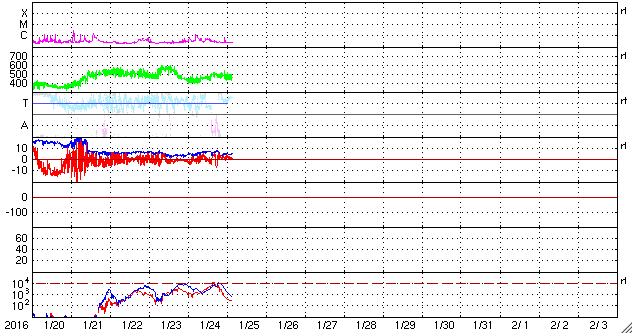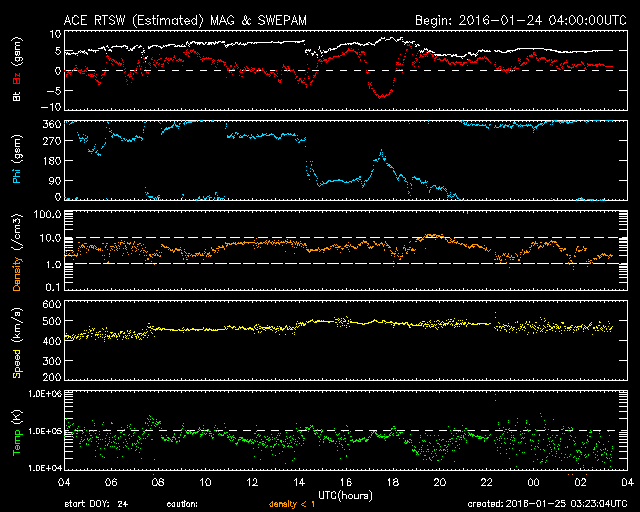 2016/ 1/25 12:24 更新 太陽風はやや高速になっています。太陽は穏やかです。 担当 篠原 太陽風の速度は、昨日の午後から少し上がって、 470km/秒前後とやや高速になっています。 磁場強度も、5nTから8nTにやや高まりましたが、 現在は5ntに戻っています。 27日周期の図を見ると、 目立つほどの変化ではありませんが、 太陽風のやや高まった状態が続いているようです。 磁場の南北成分は、 北に振れている時間が長くなっていますが、 一時的に南向きに大きく振れたところがあり、 そこで、AE指数が1000nTに達する大きい変化になっています。 その他の時間帯の磁気圏は、穏やかです。 太陽の活動は、中央の2488黒点群で、 C1.4の小さいフレアが発生した程度です。 東端の南北両側から、新しい黒点が現れています。 放射線帯の高エネルギー電子は、 2つのGOES衛星で、ともに10,000に達しています。 しばらく高まった状態が続くかもしれません。 今日は、雪のため休校となりました。 夜遅くに雪は止んだのですが、晴れて放射冷却が強まり、 今朝の気温は、手許の温度計で -5℃まで下がり、 鹿児島らしからぬ冷え込みになりました。 現在は晴れて、雪はすぐになくなってしまいそうです。 ![]() SDO衛星のAIA193カメラによる太陽コロナの様子 (c) SDO (NASA) ![]() SDO衛星による太陽の可視光写真。マウスの矢印を写真に重ねると、黒点番号付きの写真に切り替わります。 (c) SDO (NASA) ![]() ACEが観測した太陽風の磁場(1番上の枠、白線は全体の強度、赤線は南北成分) および、太陽風の密度(3番目の橙線)、速度(4番目の黄線) (c) NOAA/SWPC ![]() リアルタイムAE指数 下段のAEグラフの値が高くなると、オーロラ活動が活発化しています。 (c) 京都大学, NICT ![]() 27日の太陽周期に合わせたデータプロット 太陽が同じ面を地球に向けていた27日前の変化から、今後を予想することができます。 (c) 作図:宇宙天気ニュース
