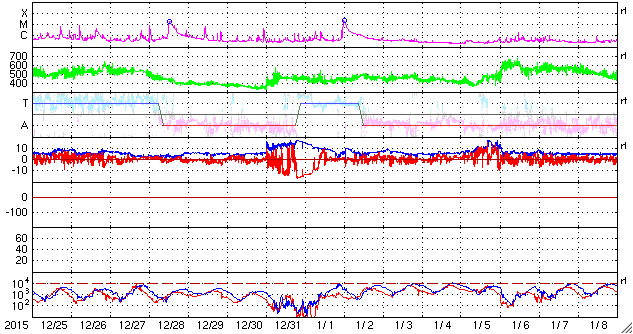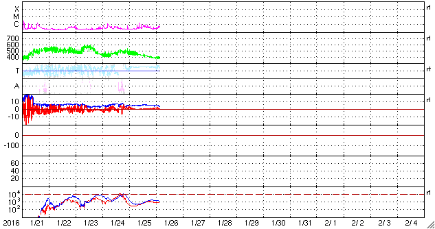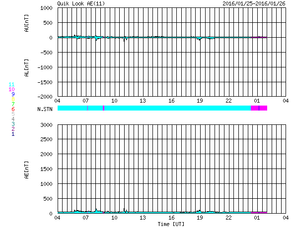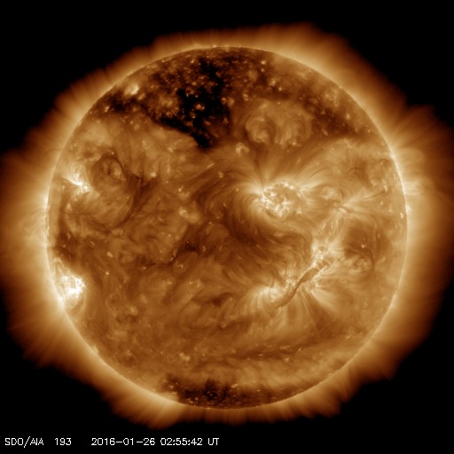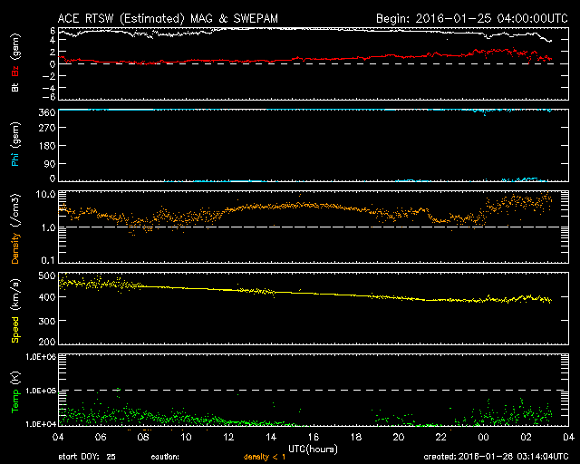 2016/ 1/26 12:14 更新 太陽風は平均的な速度に戻っています。磁気圏はとても静かです。 担当 篠原 太陽風の速度は再び低下して、 今朝には、400km/秒と平均的な状態に戻っています。 磁場強度は、5nTと平均的な強さで安定しています。 太陽風の高まりは、この辺りで通り抜けたようです。 磁場の南北成分は、北向きに振れています。 このため、磁気圏は完全に静かになっていて、 AE指数のグラフは変化がほとんど見られません。 SDO衛星AIA193の太陽写真では、 北半球の高緯度域にコロナホールが見えています。 ちょうど中心線に達していますが、緯度が高めで、 3日後くらいの太陽風に影響が見られるかどうか、 注目してください。 太陽は、東端から現れた黒点に、 2489群、2490群と番号が付けられています。 北半球の2489群が、少し活動的で、 C1.4、C1.0の小さいフレアを起こしています。 放射線帯の高エネルギー電子は、 急に1000程度に減少しています。