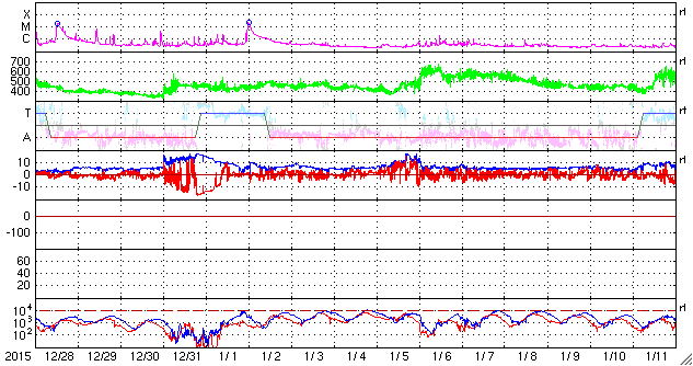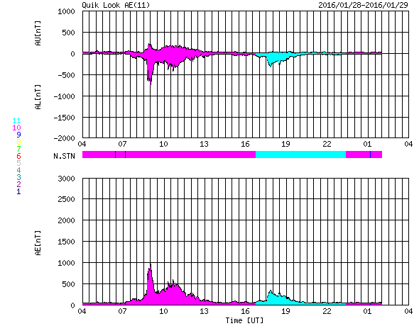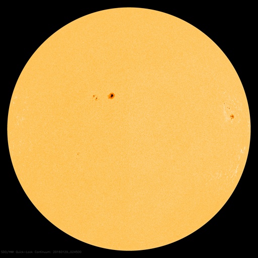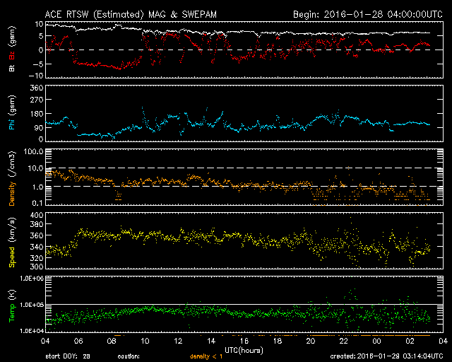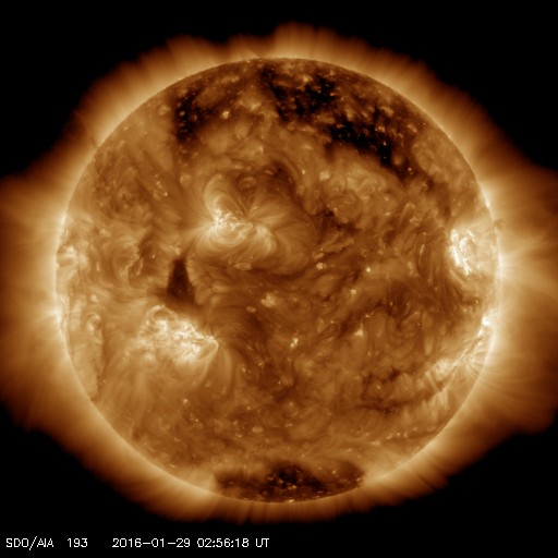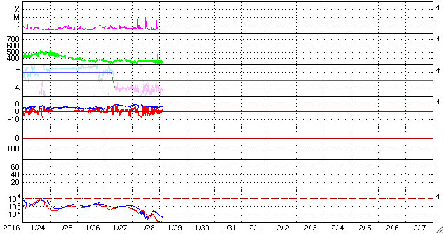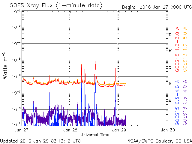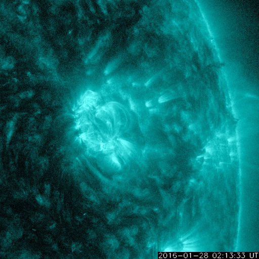 2016/ 1/29 12:12 更新 2488黒点群が活発になり、C9.6のフレアが発生しました。 担当 篠原 昨日の午後より、太陽の西の2488黒点群の活動度が上がり、 C5.3、C2.8の小規模フレアを起こし、 28日21時(世界時28日12時)には、 C9.6とMクラスに近い規模のフレアを起こしました。 2488群は今朝もC3.3のフレアを起こしています。 活動の様子をSDO衛星AIA131の動画で紹介します。 一方、可視光写真を見ると、 黒点はあまり変化していないようです。 この領域のフレアの活動が続くのかどうか、 しばらく注目して下さい。 太陽風は、速度が340〜360km/秒と低速の状態が続いています。 10nTに強まっていた磁場強度も、次第に下がっていき、 現在は5nTと平均的な値に戻っています。 磁場の南北成分は、北に向いたり南に向いたり、 時間によって変化しています。 磁場がやや強まっていたこともあり、 南を向いた時にオーロラの活動が高まって、 AE指数は、1000nTに達したり、300nTくらいに高まったりと、 変化が発生しています。 現在は太陽風の磁場強度も下がったので、 今後は、南向きに振れても弱い変化になりそうです。 ![]() 2488黒点群のフレアの様子。SDO衛星AIA131。 (c) SDO (NASA)、 (動画加工 : 宇宙天気ニュース) ![]() SDO衛星のAIA193カメラによる太陽コロナの様子 (c) SDO (NASA) ![]() SDO衛星による太陽の可視光写真。マウスの矢印を写真に重ねると、黒点番号付きの写真に切り替わります。 (c) SDO (NASA) ![]() GOES衛星の太陽X線データ (c) NOAA/SWPC ![]() ACEが観測した太陽風の磁場(1番上の枠、白線は全体の強度、赤線は南北成分) および、太陽風の密度(3番目の橙線)、速度(4番目の黄線) (c) NOAA/SWPC ![]() リアルタイムAE指数 下段のAEグラフの値が高くなると、オーロラ活動が活発化しています。 (c) 京都大学, NICT ![]() 27日の太陽周期に合わせたデータプロット 太陽が同じ面を地球に向けていた27日前の変化から、今後を予想することができます。 (c) 作図:宇宙天気ニュース