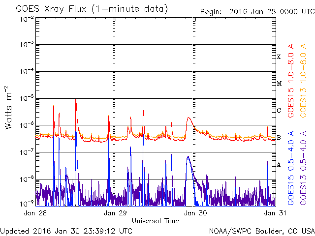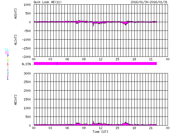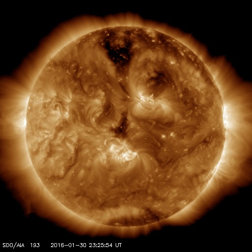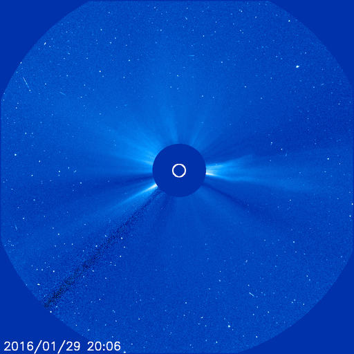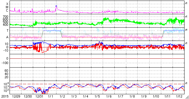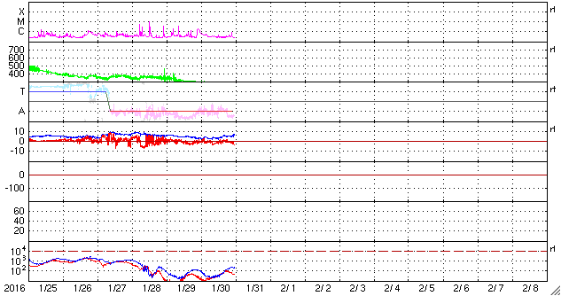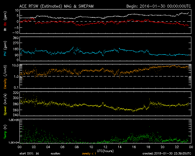 2016/ 1/31 08:39 更新 280km/秒の低速の風が続いています。磁気圏も概ね静穏です。 担当 篠原 昨日のフレアに伴って、CME(太陽ガスの放出現象)が、 太陽から西に向かって(右向き)噴出しています。 SOHO衛星LASCO C3の動画を掲載します。 ガスのかたまりが、風船の様に膨らみながら飛び出しています。 地球からは横に向かっているので、影響はありません。 太陽では、その後目立ったフレアは発生していません。 Cクラスのフレアを起こしていた2488黒点群は、 西の端に没しつつあります。 太陽風は、280km/秒とかなり遅い状態が続いています。 磁場強度は、3nTから5nTへ少し上がって、 平均的な状態に戻っています。 磁場の南北成分は、 0nT付近で小さく南寄りに変化する程度です。 磁気圏は概ね静穏で、 AE指数のグラフは、所々に100nTの変化が見られる程度です。 SDO衛星AIA193の太陽コロナの写真を見ると、 北極側から太陽の中央に向かって、 コロナホールが細く伸びています。 このコロナホールは、 27日前は、赤道付近に大きく広がっていて、 1月6日以降の高速太陽風をもたらしました。 現在は、規模がかなり小さくなっています。 太陽風への影響も小さくなり、 今回は、高速の風にはならないかもしれません。