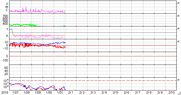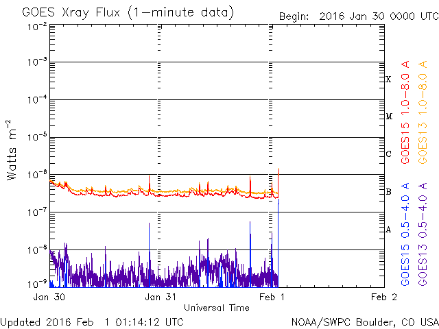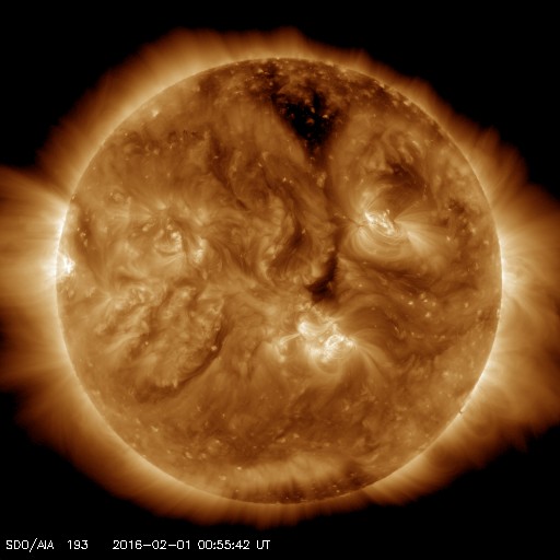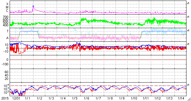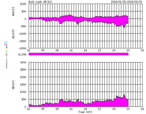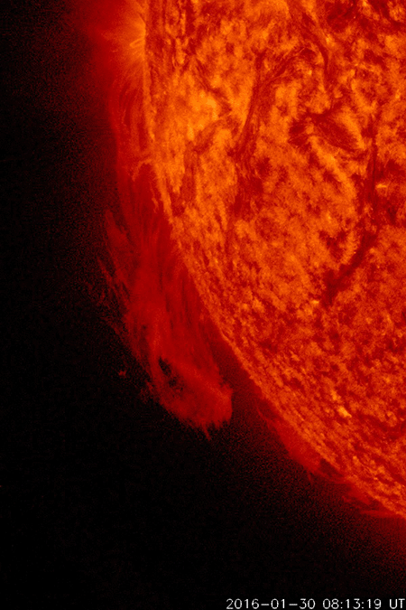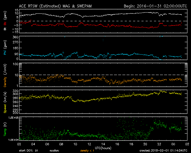 2016/ 2/ 1 10:14 更新 太陽風は300km/秒と低速ですが、磁場が南向きに変化してオーロラの活動をやや高めています。 担当 篠原 太陽の東端(左端)で、昨日の午前中に、 プロミネンスが噴き上がる現象が発生しました。 見事な噴き上がりの様子を、SDO衛星AIA304の動画で紹介します。 このプロミネンスは、29日くらいから少しずつ姿を現し、 ゆらゆらとやや不安定に動いていましたが、 31日に入った頃から上昇を始めて、ゆっくりと飛び出していきました。 SOHO衛星では、CMEも観測されていますが、 かなり淡い噴出でした。 太陽では、東端から2491黒点群が現れています。 Cクラスに達するフレアの活動はなく、 穏やかに推移しています。 太陽風は、280km/秒から300km/秒に速度が少し上がっていますが、 依然、かなり遅い状態が続いています。 磁場強度はやや強まっていて、 7〜10nT付近でゆっくりと変化しています。 磁場の南北成分は、南向きに振れ続けるようになり、 -5nT前後を推移しています。 このため、磁気圏の活動もある程度高まっていて、 AE指数は、500nT前後の中規模の変化が、連続的に発生しています。 アラスカのカメラでは、オーロラの活動も撮影されていて、 極域の空はにぎわっているようです。 太陽風の速度が遅くなっているので、 磁場の南向きの変化も、もうしばらく続くかもしれません。 それに伴って、オーロラの高まりもしばらく続く可能性があります。