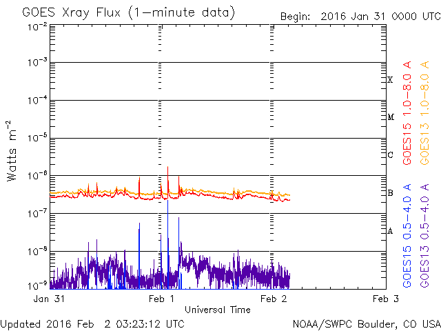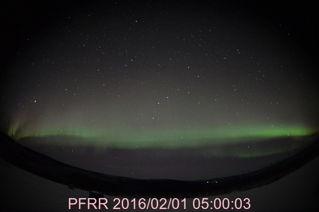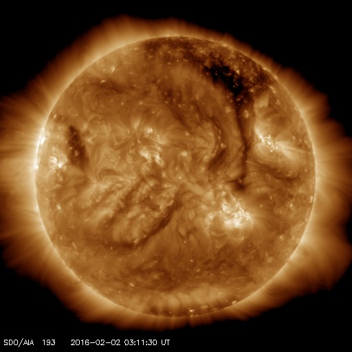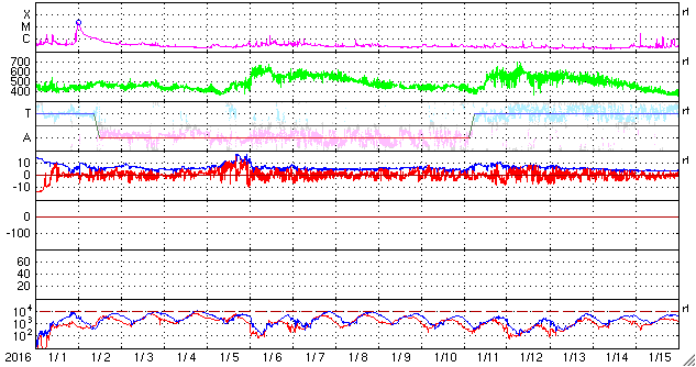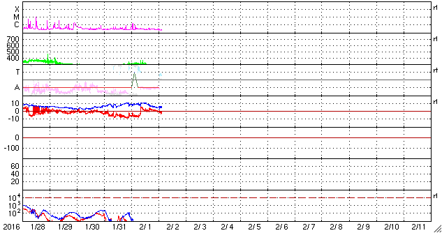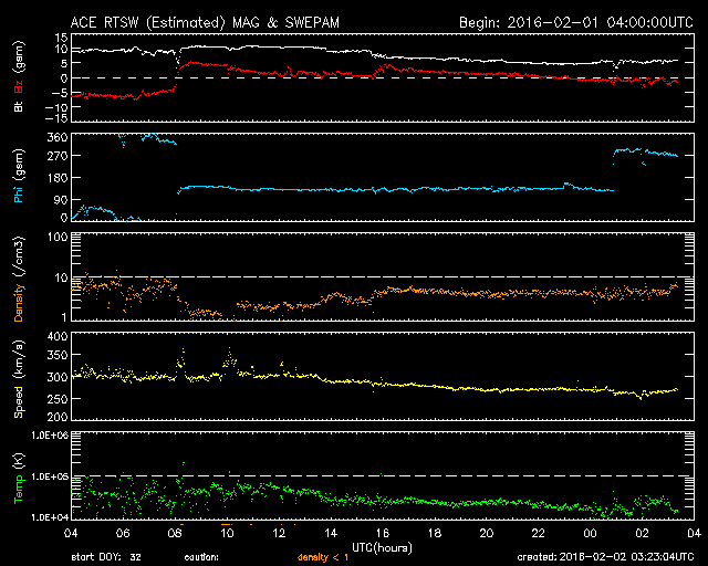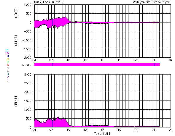 2016/ 2/ 2 12:24 更新 太陽風の速度は、260km/秒近くまで下がっています。磁気圏は穏やかです。 担当 篠原 太陽風の速度は、300km/秒から再び低下し、 260km/秒近くまで下がっています。 かなり遅い状態です。 10nTに強まっていた磁場強度も、 現在は5nTと平均的な値に戻っています。 南向きが続いていた、磁場の南北成分は、 昨夕、1日17時(世界時1日8時)に、北向きに切り替わり、 最初は5nT程度まで振れましたが、次第に下がって、 0nT付近で小さく変化するようになっています。 磁気圏の活動も、この切り替わりの影響を受けて、 AE指数は、初めの頃に500nTの変化が起きていますが、 磁場が北向きに切り替わった中盤以降は、 変化がとても小さくなっています。 AE指数が高まっていた頃の、 アラスカのオーロラの様子を動画で紹介します。 長い時間、ずっとオーロラが現れ続けています。 27日周期の図の太陽風磁場のグラフを見ると、 この2日ほど、まとまった磁場の変化が来ていたようです。 その高まりも終わって、太陽風は穏やかになっています。 太陽は、目立ったフレアの発生はなく、穏やかです。