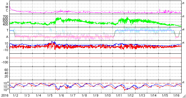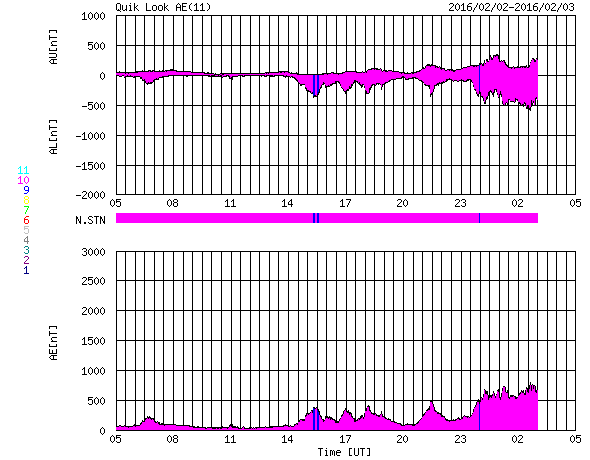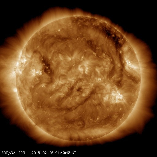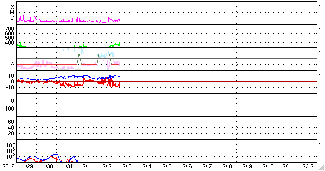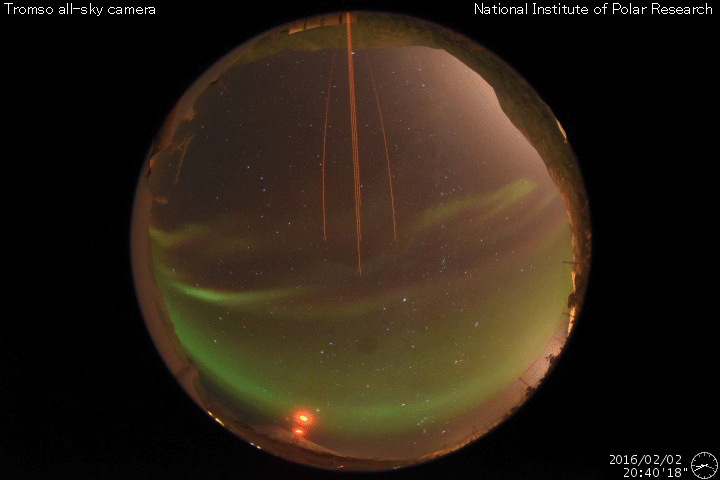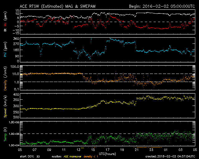 2016/ 2/ 3 13:58 更新 太陽風が強まって、磁気圏の活動をやや高めています。 担当 篠原 今日に入った頃より、太陽風の弱い高まりが始まっています。 磁場強度は、5nTから10nTへ上がり、 速度は、270km/秒というかなり遅い状態から、 350km/秒と普通の低速風程度に変化しています。 SDO衛星AIA193の太陽写真の北半球に見えていた、 細長いコロナホールの弱い影響がやって来たのかもしれません。 磁場が強まった後、南北成分が南向きに振れ、 -5〜 -8nTの変化が続いています。 このため、磁気圏の活動も高まり、 AE指数は、400〜700nTと小中規模の変化が続くようになっています。 ノルウェー・トロムソの全天カメラの動画を掲載します。 世界時2日21〜22時頃の様子で、 AE指数に、500nTの高まりが起きている頃です。 ACE衛星の最新の値では、 太陽風磁場の南北成分は北向きになっています。 このまま北向きに切り替わってしまうと、オーロラの活動は弱まります。 再び南向きに戻るかどうか、注目して下さい。 太陽は、東端から2492黒点群が現れ、 中央部にも新しい黒点が出現しています。 X線グラフでは、C1.2の小さい変化が発生していますが、 これは、東端の向こう側で発生した現象です。 この後に、もう一つ黒点群が現れるかもしれません。 ![]() ノルウェー・トロムソの全天カメラにより撮影された、世界時2日21〜22時頃のオーロラ。 (c) 国立極地研究所、(動画加工 : 宇宙天気ニュース) ![]() SDO衛星のAIA193カメラによる太陽コロナの様子 (c) SDO (NASA) ![]() SDO衛星による太陽の可視光写真。マウスの矢印を写真に重ねると、黒点番号付きの写真に切り替わります。 (c) SDO (NASA) ![]() ACEが観測した太陽風の磁場(1番上の枠、白線は全体の強度、赤線は南北成分) および、太陽風の密度(3番目の橙線)、速度(4番目の黄線) (c) NOAA/SWPC ![]() リアルタイムAE指数 下段のAEグラフの値が高くなると、オーロラ活動が活発化しています。 (c) 京都大学, NICT ![]() 27日の太陽周期に合わせたデータプロット 太陽が同じ面を地球に向けていた27日前の変化から、今後を予想することができます。 (c) 作図:宇宙天気ニュース
