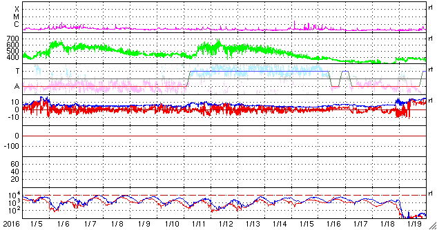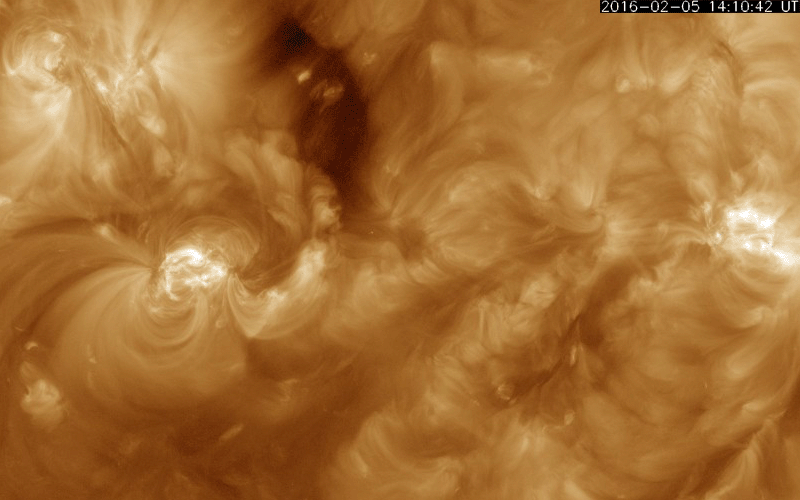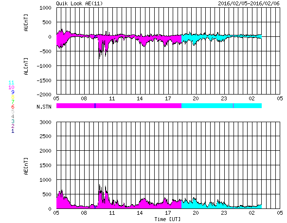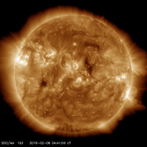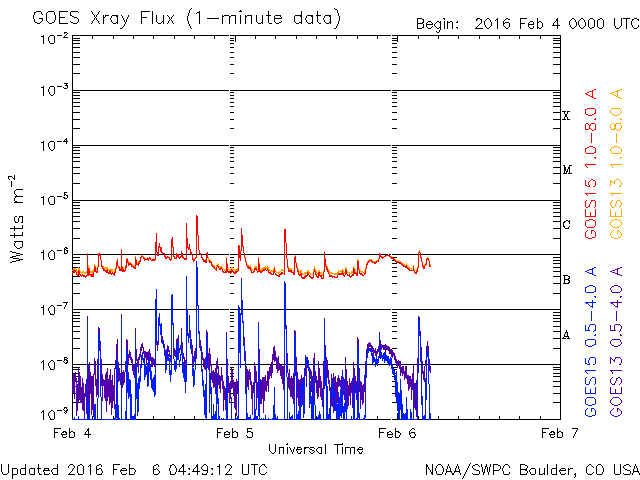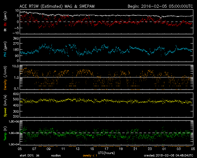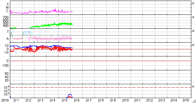 2016/ 2/ 6 13:49 更新 太陽は比較的穏やかです。太陽風はやや高速で安定しています。 担当 篠原 太陽の中央の2494黒点群は、 C3.0、C2.9、C1.1の小規模フレアを起こしています。 活動は続いていますが、規模が大きくなる様子はありません。 この黒点群の周辺で、6日5時(世界時5日20時)頃に、 全体が連動するような爆発的な現象が発生しました。 SDO衛星AIA193による動画を掲載します。 GOES衛星のX線グラフでも、 C1に達する程度の長い時間の増加として観測されています。 この現象に伴って、弱いCMEも噴出しているかもしれません。 SOHO衛星の画像がまだ公開されていないので、 現時点では様子は分かりません。 太陽は、小さい黒点があちこちに見えていて、 群番号は賑わっています。 東端からもうひとつ、新しい黒点群が現れたようです。 太陽風は、450km/秒とやや高速の状態が続いています。 磁場強度は、5nTと平均的な値に下がっています。 磁場の南北成分は、南北にゆっくり変化しています。 磁気圏では小規模の活動が続いていて、 AE指数は300nTから500nTの変化が良く起きています。