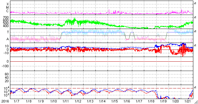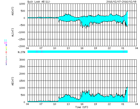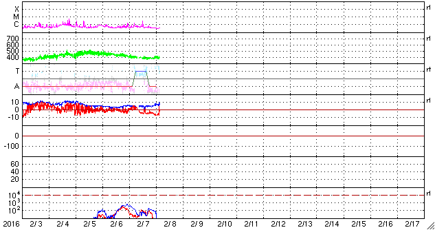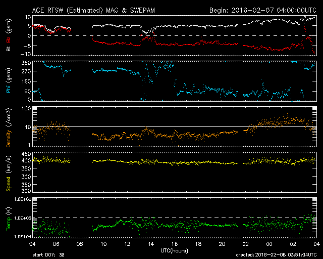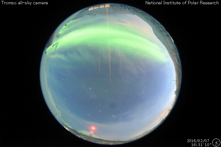 2016/ 2/ 8 12:51 更新 太陽風磁場が南向きに変化して、磁気圏の活動が高まっています。ニュージーランドのオーロラをどうぞ。 担当 篠原 ニュージーランド南島ダニーデンの中村太一さんより、 元日に発生したオーロラ(1月4日の記事で紹介)の、 横9枚、縦2枚、計18枚の写真を組み合わせて作った、 パノラマ写真が届きました。 横方向の広がりは、120度くらいになるとのことで、 目の前に広がる光景を、そのまま切り取ったかのような写真です。 画面いっぱいに広げて、ご覧下さい。 撮影には、時間と手間の両方がかかるとのことですが、 独特の雰囲気が漂う、素晴らしい写真になっています。 ぜひ、1月4日の写真とも見比べて下さい。 どうもありがとうございます。 太陽風は、速度400km/秒、磁場強度5nTと どちらも平均的な状態が続いていましたが、 今朝くらいから磁場がやや強まって、 現在は8nTくらいになっています。 目立つのは、南北成分の変化で、 昨夕、7日18時(世界時7日9時)以降、南向きに振れ続け、 -5nTから、今朝は -7nTまで変化しています。 このため、磁気圏の活動も連続的に高まっていて、 AE指数は、グラフの中盤以降、 500〜800nTの中規模の変化が発生しています。 グラフの最後では、1000nTに達しています。 AE指数が800nTくらいに高まっていた、 世界時7日17時頃のオーロラの様子を、 ノルウェー・トロムソの全天カメラの動画で紹介します。 2月4日のニュースでお知らせしたフィラメント噴出による 太陽風磁場の変化かもしれません。 南向きの変化はこのまま続くのか、北向きに反転するのか、 北向きに変わってしまうと、 磁気圏の活動も終わってしまうでしょう。 太陽は、北東(左上)の2496黒点群の活動が高まり、 C1.7、C1.1、C2.7の小規模フレアを起こしています。 一方、昨日まで目立っていた、 西側(右側)の2494群のフレアは静かになっています。 ![]() ニュージーランド南島で、現地1日に撮影されたオーロラ。9枚×2列の写真を重ねて作ったパノラマ写真。 (c) 中村太一氏 ![]() ノルウェー・トロムソの全天カメラにより撮影された、世界時7日17時頃のオーロラ。 (c) 国立極地研究所、(動画加工 : 宇宙天気ニュース) ![]() SDO衛星のAIA193カメラによる太陽コロナの様子 (c) SDO (NASA) ![]() SDO衛星による太陽の可視光写真。マウスの矢印を写真に重ねると、黒点番号付きの写真に切り替わります。 (c) SDO (NASA) ![]() ACEが観測した太陽風の磁場(1番上の枠、白線は全体の強度、赤線は南北成分) および、太陽風の密度(3番目の橙線)、速度(4番目の黄線) (c) NOAA/SWPC ![]() リアルタイムAE指数 下段のAEグラフの値が高くなると、オーロラ活動が活発化しています。 (c) 京都大学, NICT ![]() 27日の太陽周期に合わせたデータプロット 太陽が同じ面を地球に向けていた27日前の変化から、今後を予想することができます。 (c) 作図:宇宙天気ニュース