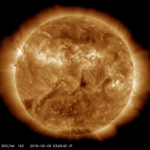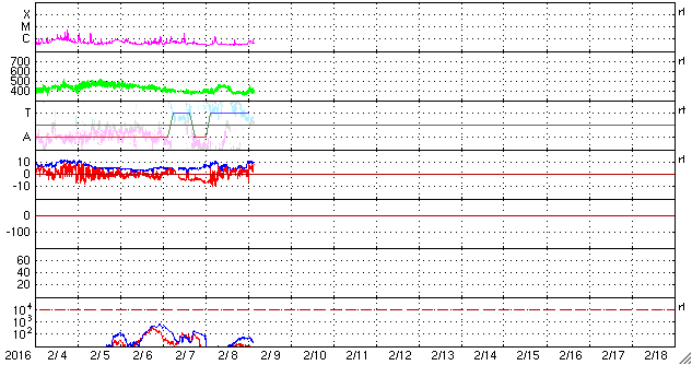 2016/ 2/ 9 12:46 更新 太陽風の磁場がやや強まっています。カナダのオーロラをどうぞ。 担当 篠原 高坂雄一さんより、カナダで現地7日19時(世界時8日2時)頃 に撮影されたオーロラの写真をいただきました。 撮影地点は、イエローナイフから南西へ320kmの 先住民の村、Fort Providence とのことです。 現地では、この頃からオーロラが強まったそうで、 昨日のニュースのAE指数の最後の高まりの頃のオーロラです。 この冬のイエローナイフは曇り空が多く、 晴れ間を探して移動しての撮影になっているそうです。 写真の1枚目は、天体用改造機のCanon 5D2、2枚めはNikon 810A の撮影とのことです。 撮影の詳細は分かりませんが、ご参考までに。 画面いっぱいのオーロラは、素晴らしい迫力ですね。 貴重な速報をどうもありがとうございます。 太陽風は、400〜450km/秒と平均的な速度が続いています。 磁場強度は、昨日のニュース以降、10nTから5nTへ下がりましたが、 今朝から再び10nTに高まっています。 6日に発生した弱いCMEの影響が、そろそろ到来する可能性があります。 現在の磁場の強まりは、その変化の始まりでしょうか。 磁場の南北成分は、昨日の夕方以降は北寄りになっています。 このため、磁気圏の活動も弱まっていて、 AE指数は、最初に1000nTの大きい変化がありますが、 それ以降はほとんど変化がなくなっています。 太陽風の磁場が強まっているので、 今後、南向きに切り替わると、 オーロラの活動も強まる可能性があります。 太陽は、2492黒点群でC1.6の小規模フレアが起きた程度です。 2496群の活動は目立たなくなっています。 SOHO衛星LASCO C2、C3によると、 太陽の北東(左上)に向かって、CMEの噴出が発生しています。 噴き出す様子から、フィラメント噴出によると思われますが、 SDO衛星の太陽画像には現象は見られないため、 太陽の向こう側で発生したようです。 地球への影響はありません。 ![]() カナダ・イエローナイフ近郊で撮影された、現地7日19時頃のオーロラ。 (c) 高坂雄一氏 ![]() カナダ・イエローナイフ近郊で撮影された、現地7日19時頃のオーロラ。 (c) 高坂雄一氏 ![]() 太陽の北東側に噴き出すCME。SOHO衛星LASCO C2、C3。 (c) SOHO (ESA & NASA)、 (動画加工 : 宇宙天気ニュース) ![]() SDO衛星のAIA193カメラによる太陽コロナの様子 (c) SDO (NASA) ![]() SDO衛星による太陽の可視光写真。マウスの矢印を写真に重ねると、黒点番号付きの写真に切り替わります。 (c) SDO (NASA) ![]() ACEが観測した太陽風の磁場(1番上の枠、白線は全体の強度、赤線は南北成分) および、太陽風の密度(3番目の橙線)、速度(4番目の黄線) (c) NOAA/SWPC ![]() リアルタイムAE指数 下段のAEグラフの値が高くなると、オーロラ活動が活発化しています。 (c) 京都大学, NICT ![]() 27日の太陽周期に合わせたデータプロット 太陽が同じ面を地球に向けていた27日前の変化から、今後を予想することができます。 (c) 作図:宇宙天気ニュース