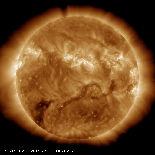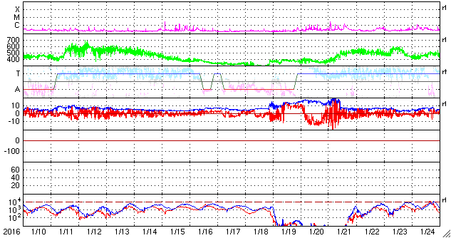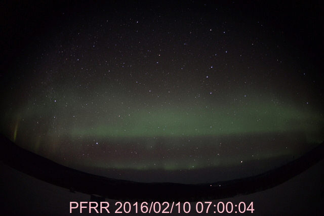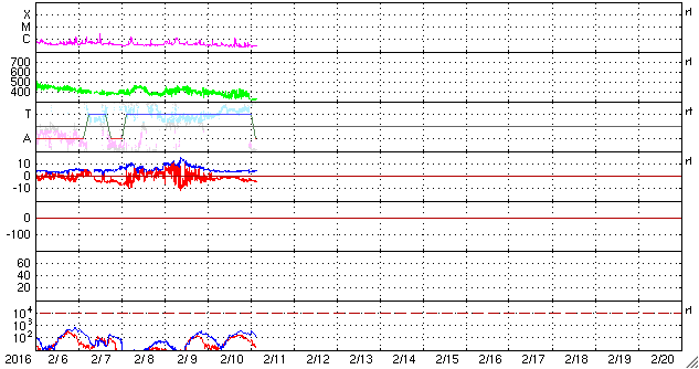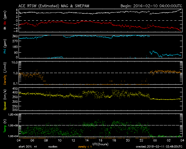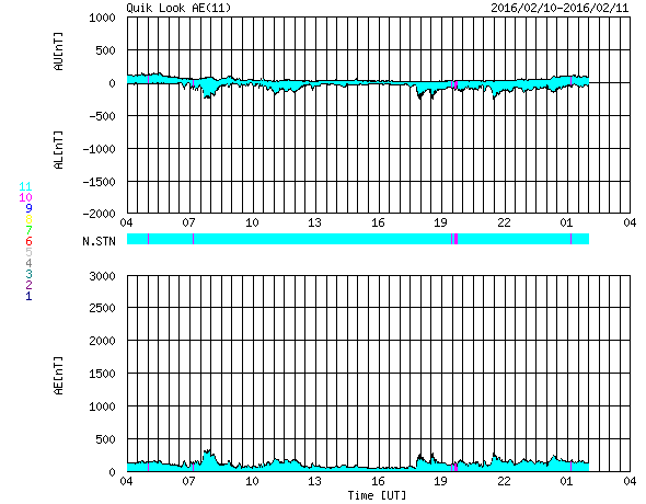 2016/ 2/11 12:49 更新 太陽風は低速の状態になっています。小規模の磁気圏活動が続いています。 担当 篠原 太陽風は、速度が低下して、 320km/秒と低速の風になっています。 27日周期の図を見ると、 前周期も1月16日から18日にかけて、速度が下がっていました。 この変化が回帰してきたのかもしれません。 磁場強度は、4nTとやや弱くなっていて、 南北成分は南向きに振れ続けています。 このため、磁気圏の活動は連続的に発生しているようで、 AE指数は、200〜300nTと小さい変化ですが、 連続的に発生しています。 これは、太陽風の南向き磁場の振れ幅が小さく、 速度も遅くなっているため、 磁気圏への影響の及び方が弱くなっているためでしょう。 アラスカ、フェアバンクスのオーロラカメラでは、 北側の低空にオーロラの輝きがずっと現れ続けています。 時々、頭の上で明るく輝く瞬間も見られます。 低速の風は、数日続きそうです。 磁場の変化はどうなるでしょうか。 太陽は、2497黒点群でC1.3の小さいフレアが起きた程度で、 穏やかです。