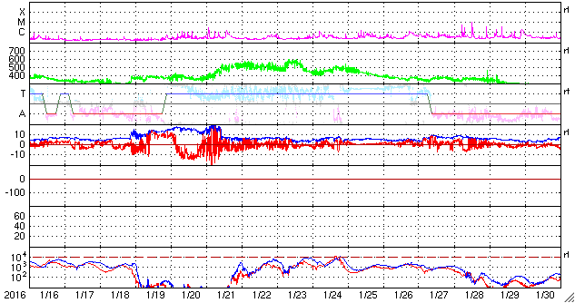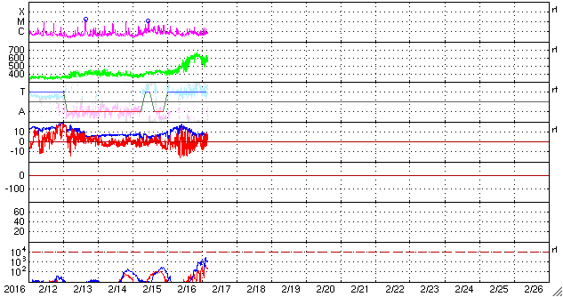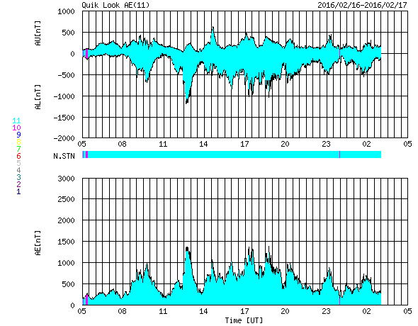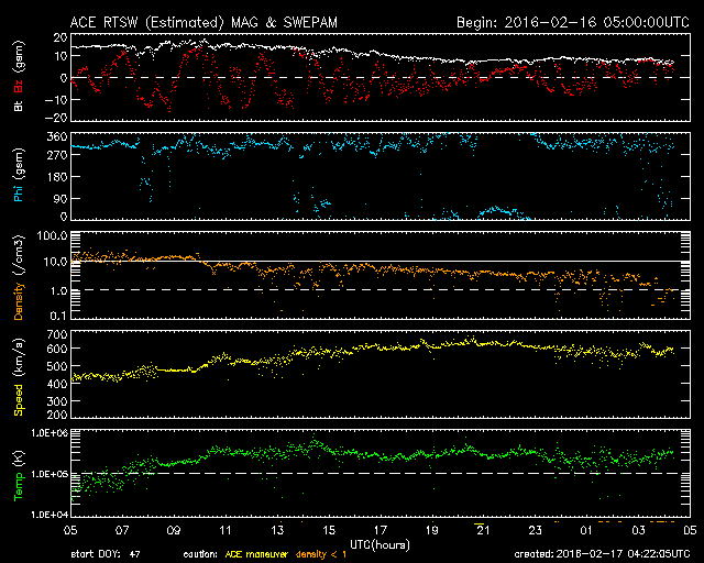 2016/ 2/17 13:22 更新 高速太陽風が到来し、600km/秒に高まっています。フェアバンクスのオーロラをどうぞ。 担当 篠原 アラスカ・フェアバンクスで撮影されたオーロラ写真を、 臼井元明さんよりいただきました。 オーロラツアーに参加されたとのことで、 1枚目より、世界時12日10:00、13日10:40、14日05:50の撮影です。 臼井さんによると、3日ともほぼ連続して観測ができたそうで、 太陽風の磁場が南寄りになった頃には、 弱いながらブレイクアップも起きたそうです。 ニュースでは、2月13日、14日、15日の記事で、 太陽風やAE指数の様子を見ることができます。 AE指数は300〜500nTくらいの変化が起きていて、 大きな活動ではありませんが、頭上で輝くオーロラは見事です。 写真の背景には、カシオペヤ座、ぎょしゃ座などの星々が輝き、 オーロラの光を映す雪景色も素敵な雰囲気です。 臼井さんからは、毎年オーロラの写真を送っていただいています。 読者写真集のページでぜひご覧下さい。 今回もどうもありがとうございます。 昨夜より、太陽風の速度が高まっています 16日19時(世界時16日10時)頃に500km/秒を超え、 今日に入る頃には、600km/秒に達しています。 コロナホールの影響がやって来たようです。 15nTに強まっていた太陽風の磁場強度は、 7nTへ下がっています。 27日周期の図を見ると、 高速の太陽風は、前周期よりも1日ほど早く始まり、 最高速度は500km/秒から600km/秒へ高まっています。 SDO衛星AIA193の太陽コロナ写真では、 コロナホールは、南極に近づきながら太陽を東西に広がっています。 高速風の影響もどのくらいまで続くのか、 今後の変化に注目して下さい。 太陽風の高まりにより、磁気圏の活動も強まっています。 AE指数は、1000nTを超える活発な変化が長い時間発生しています。 グラフの後半は、太陽風の磁場強度が下がってきたことも影響して、 変化は小さくなっていますが、 それでも、500nTを超えていて、依然活発です。 太陽では、2497黒点群のフレア活動が続いています。 しかし、フレアの規模はC1〜3程度に留まり、 X線グラフの変化も一段下がっています。 2497黒点群は太陽の西の端に達していて、 このまま見えなくなっていきます。 その後、太陽は穏やかになりそうです。
