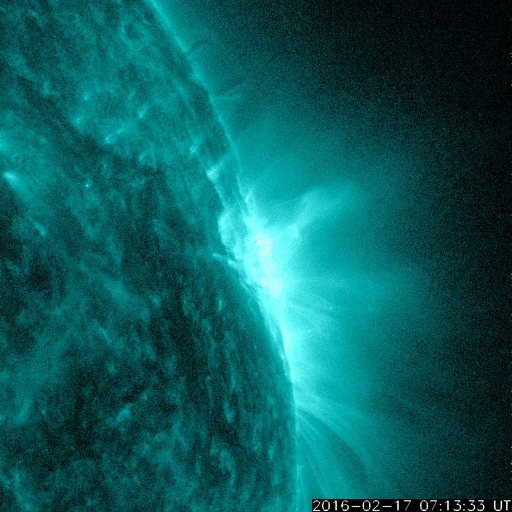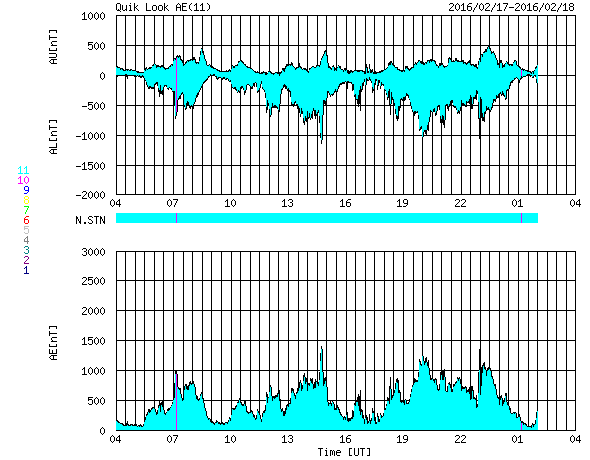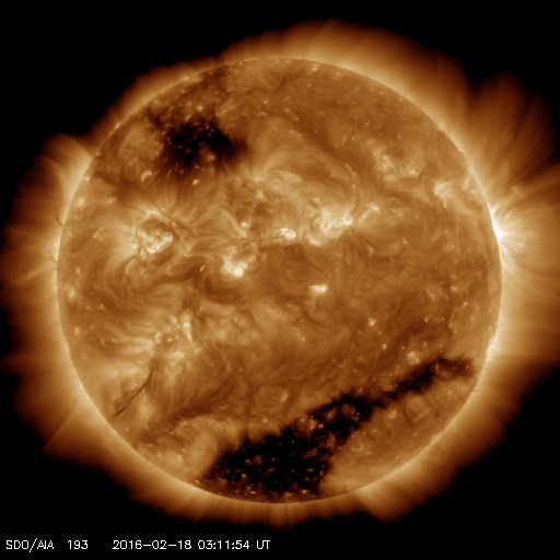 2016/ 2/18 12:18 更新 高速太陽風が続き、オーロラの活動も活発です。ニュージーランドのオーロラをどうぞ。 担当 篠原 一昨日、16日の夜から高速の太陽風が続いています。 この始まりの頃のオーロラの写真を、 ニュージーランド・ダニーデンの中村太一さんよりいただきました。 1枚目は、現地16日22:24(世界時16日10:24)の撮影で、 月光がまだある中、オーロラが強く輝いていたそうです。 写真の中央に、明るい流星が見事に流れています。 (水平線の明るい光は、イカ釣り漁船のLEDだそうです) 2枚目は、現地17日01:07(世界時16日13:07)、 月が背後の山脈に沈み、暗くなってきた頃で、 潮が満ちてきて浅瀬の水面にオーロラがきれいに反射していたそうです。 この頃は、太陽風の磁場強度が高まり、南北に大きく変化していました。 この影響で、オーロラの活動も高まっていました。 どちらもとても雰囲気のある写真で、いつまでも眺めていたくなります。 貴重な速報をどうもありがとうございます。 太陽風は、速度の高まった状態が続いてます。 昨日、600km/秒に達していた太陽風の速度は、 夜にかけて550km/秒へ少し下がっていました。 しかし、今朝になると再び上昇して、現在は600km/秒台に戻っています。 磁場強度は、昨日から今朝にかけて、 7〜8nTとやや強まった状態が続いています。 ACE衛星の図の最後のところで、6nTに下がりかけていて、 最大の領域は越えたのかもしれません。 磁場の南北成分は、南北に頻繁に変化しています。 -5nT程度の南向きが続き、速度も高まっているため、 オーロラの活動はかなり高まっていて、 AE指数は、800nT〜1200nTの活発な変化が、 1日を通して発生しています。 極域では、かなりにぎやかな夜を迎えているのではないでしょうか。 SDO衛星AIA193では、南半球のコロナホールは、 西側に進むとともに、南極側に伸びていて、 影響は次第に弱まっていきそうです。 一方、北半球の東側の中緯度域には、 別のコロナホールが見えています。 4〜5日後くらいからは、こちらの影響が及びそうです。 太陽では、2497黒点群が西の端に没していき、 見えなくなっています。 最後まで活発に活動を起こしていて、 18日0時(世界時17日15時)に、C9.4、 18日3時(世界時17日18時)に、C7.4、 18日11時(世界時18日2時)に、C7.2 などの小規模フレアを起こし、 この他にも、C1〜4のフレアを10回ほど起こしています。 2497黒点群のフレアの様子を、 SDO衛星AIA131の動画で紹介します。 ![]() ニュージーランド南島ダニーデンで、現地16日22:24(世界時16日10:24)に撮影されたオーロラ。 (c) 中村太一氏 ![]() ニュージーランド南島ダニーデンで、現地17日01:07(世界時16日13:07)に撮影されたオーロラ。 (c) 中村太一氏 ![]() 太陽の西に沈みかけた2497黒点群のフレアの様子。SDO衛星AIA131。 (c) SDO (NASA)、 (動画加工 : 宇宙天気ニュース) ![]() SDO衛星のAIA193カメラによる太陽コロナの様子 (c) SDO (NASA) ![]() SDO衛星による太陽の可視光写真。マウスの矢印を写真に重ねると、黒点番号付きの写真に切り替わります。 (c) SDO (NASA) ![]() ACEが観測した太陽風の磁場(1番上の枠、白線は全体の強度、赤線は南北成分) および、太陽風の密度(3番目の橙線)、速度(4番目の黄線) (c) NOAA/SWPC ![]() リアルタイムAE指数 下段のAEグラフの値が高くなると、オーロラ活動が活発化しています。 (c) 京都大学, NICT ![]() 27日の太陽周期に合わせたデータプロット 太陽が同じ面を地球に向けていた27日前の変化から、今後を予想することができます。 (c) 作図:宇宙天気ニュース