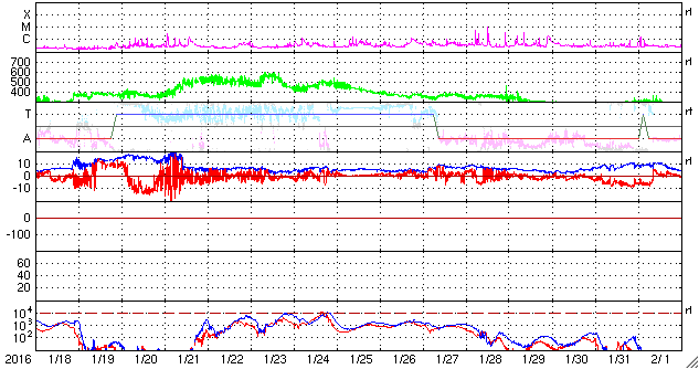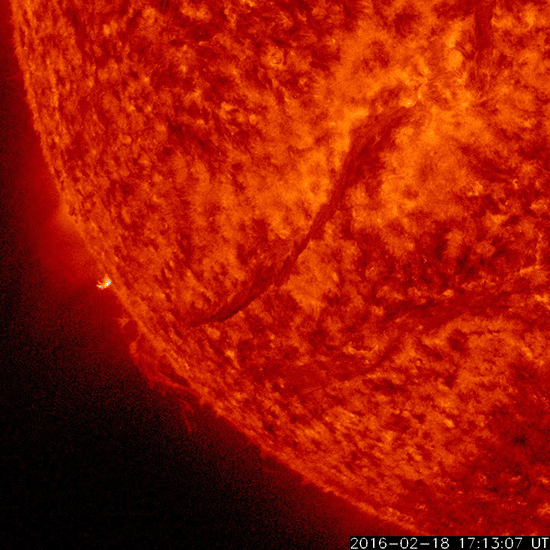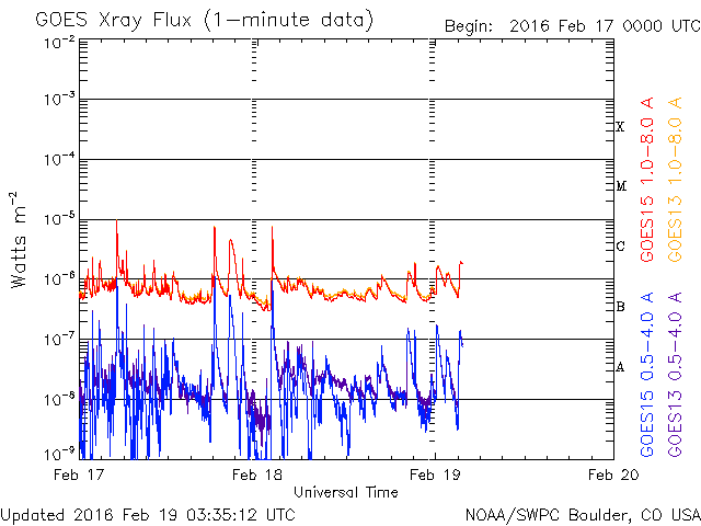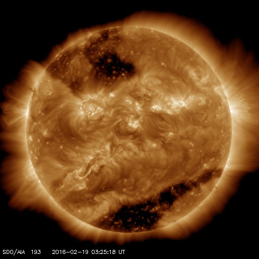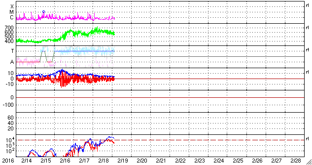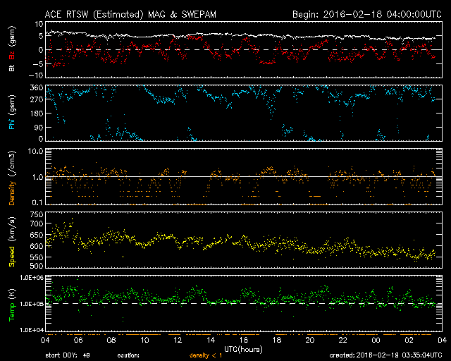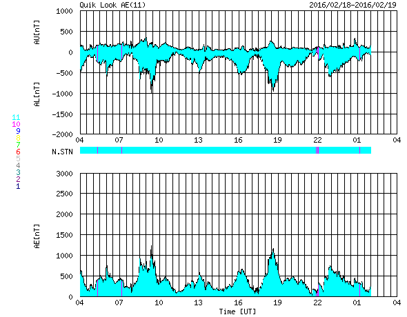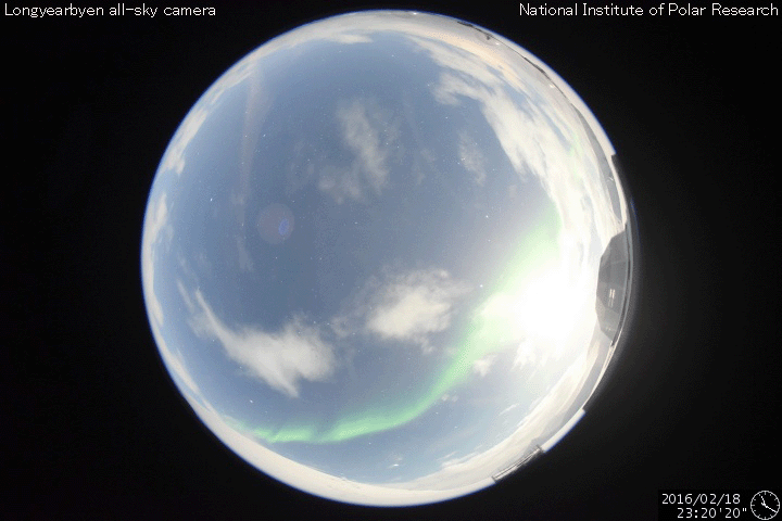 2016/ 2/19 12:35 更新 太陽風は高速の状態が続き、磁気圏の活動も高まっています。 担当 篠原 太陽風は、高速の風が続いています。 速度は、昨日の650km/秒からゆっくりと低下していますが、 現在も550km/秒と高速状態です。 磁場強度は、7nTから4nTへ下がっています。 高速風としては、最大の領域を通過したようです。 磁場の南北成分は、+3nTと -3nTくらいの間で、 南北に頻繁に変化しています。 速度が高まっていることもあり、磁気圏の活動は高まっています。 AE指数は、500nTの中規模の変化が一日中続き、 1000nTに達する大きい変化も発生しています。 AE指数のグラフの最後の高まりに相当するオーロラの活動を、 ノルウェー・スバールバル島の全天カメラの動画で紹介します。 月が明るく、空の条件は良くありませんが、 オーロラの光が何度も空を覆っています。 高速の太陽風は、これから次第に低下しそうです。 一方、SDO衛星AIA193では、 北半球のコロナホールが太陽の中心線に達し、 次に紹介するフィラメント噴出の影響も、 3日後くらいに地球に到来するかもしれません。 結果的に、太陽風の高まりは来週にかけて続くかもしれません。 太陽では、今朝、19日7時(世界時18日22時)に、 南東部(左下)でフィラメント噴出が発生しました。 SDO衛星AIA304の動画を掲載します。 黒いコロナガスの筋が、噴き上がるように飛び出しています。 これにより、CME(太陽ガスの放出現象)も発生していると思われますが、 SOHO衛星の画像が更新されていないため、まだ確認できません。 明日のニュースで紹介できると思います。 CMEによる太陽風の乱れが、 3日後の22日頃に地球にやって来る可能性があります。 磁場の強まりが運ばれてきて、大きく南向きに変化すると、 磁気圏の活動も活発になるでしょう。 この他に、太陽では、 西に沈んでいった2497黒点群で、C1の小さいフレアが3回、 2501黒点群でC1.8のフレアが起きた程度で、 フレアの活動は少なくなっています。 太陽風の高まりの影響で、 放射線帯の高エネルギー電子が増加しています。 GOES-15(青線)、GOES-13(赤線)の両方で、 10,000を超えています。 ![]() ノルウェー・スバールバル島のLongyearbyenで全天カメラにより撮影された、世界時18日23時頃のオーロラ。 (c) 国立極地研究所、(動画加工 : 宇宙天気ニュース) ![]() 太陽の南東部で発生したフィラメント噴出。SDO衛星AIA304。 (c) SDO (NASA)、作図:宇宙天気ニュース ![]() SDO衛星のAIA193カメラによる太陽コロナの様子 (c) SDO (NASA) ![]() SDO衛星による太陽の可視光写真。マウスの矢印を写真に重ねると、黒点番号付きの写真に切り替わります。 (c) SDO (NASA) ![]() ACEが観測した太陽風の磁場(1番上の枠、白線は全体の強度、赤線は南北成分) および、太陽風の密度(3番目の橙線)、速度(4番目の黄線) (c) NOAA/SWPC ![]() リアルタイムAE指数 下段のAEグラフの値が高くなると、オーロラ活動が活発化しています。 (c) 京都大学, NICT ![]() 27日の太陽周期に合わせたデータプロット 太陽が同じ面を地球に向けていた27日前の変化から、今後を予想することができます。 (c) 作図:宇宙天気ニュース