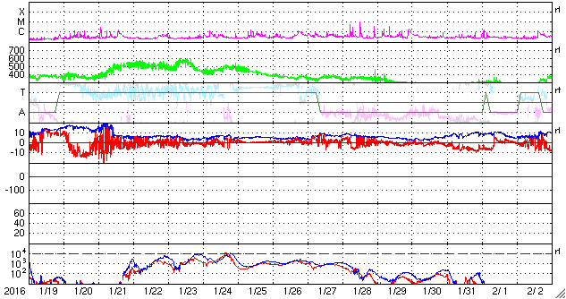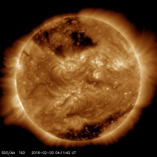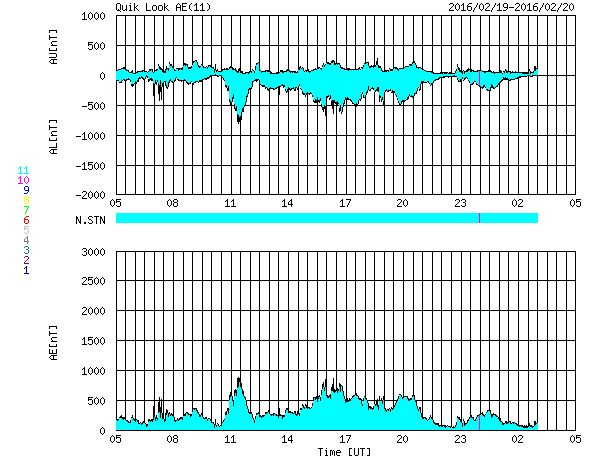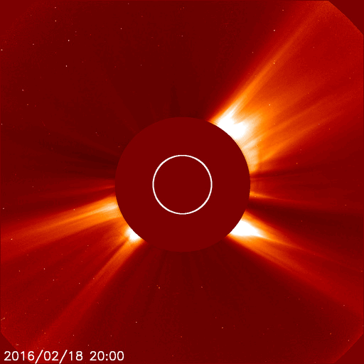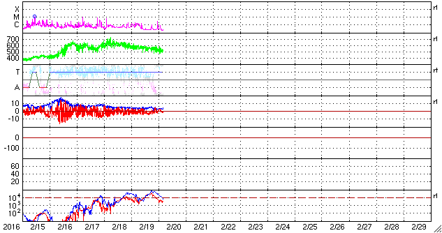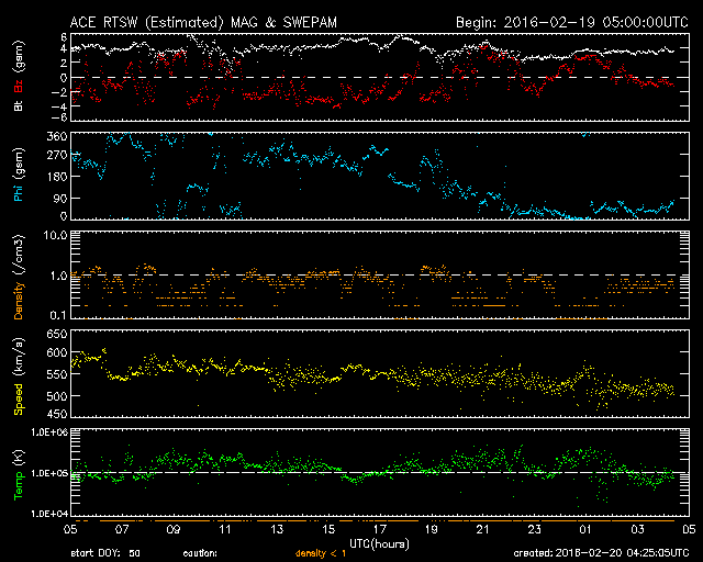 2016/ 2/20 13:25 更新 500km/秒台の高速太陽風が続いています。磁気圏の活動は弱まりかけています。 担当 篠原 昨日のフィラメント噴出によるCMEの様子が、 SOHO衛星LASCO C2カメラで撮影されています。 噴出するガスは、ほとんどが左下に向かっていて、 地球の方向には向かっていないようです。 目立つほどの太陽風の乱れは、来ないように思います。 太陽では、2497黒点群が見えなくなりましたが、 南東端(左下側)から活動的な領域が近づいていて、 C1.2、C2.7の小規模フレアを起こしています。 この後、黒点が姿を現しそうです。 太陽風は、速度の低下がゆっくりと続き、 昨日の570km/秒から、現在は520km/秒へ下がっています。 高速の状態は続いています。 磁場強度は、4nT前後で安定しています。 南北成分は、グラフの前半は南寄りで、 AE指数も、500〜800nTの中規模の変化が続いています。 しかし、ACEのグラフの後半からは、 磁場はやや北寄りになっています。 AE指数もこれに合わせて、 後半では変化がやや小さくなっています。 高速太陽風はもうしばらく続きそうですが、 磁場の方向がこのままだと、 オーロラの活動は先に弱まりそうです。 SDO衛星AIA193の太陽コロナ写真では、 北半球のコロナホールが中央線上に見えています。 緯度がやや高めなのですが、 地球にどの程度の影響がやって来るでしょうか。 早ければ、明後日から変化が見え始めるかもしれません。 放射線帯の高エネルギー電子は、更に数値が高まっています。 GOES-15の青線は、10万の線に達するでしょうか。