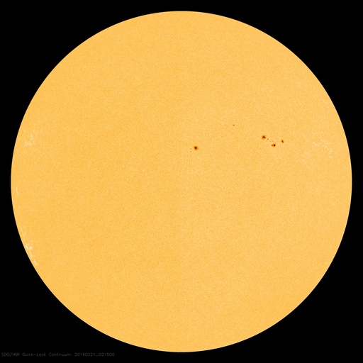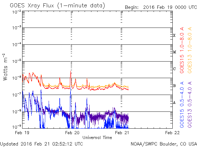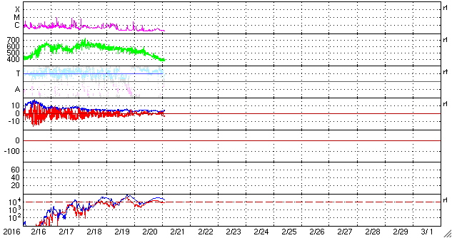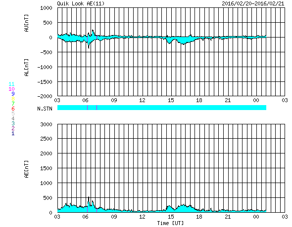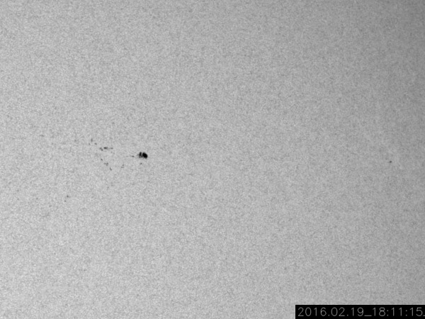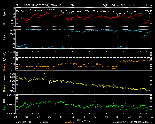 2016/ 2/21 11:52 更新 太陽風の速度は下がり、磁気圏も穏やかになっています。 担当 篠原 太陽風の速度は、 昨日の夕方まで、500km/秒と高速の状態を保っていましたが、 その後、低下が始まり、 今朝くらいに、400km/秒と平均的な速さに戻りました。 現在は370km./秒と、低速の風になりつつあります。 磁場強度は、時々弱まったりしながらですが、 4nTと平均的な状態が続いています。 磁場の南北成分は、0nT付近を小さく変化していて、 磁気圏への影響は弱く、 AE指数のグラフは、小さい活動が見られる程度です。 太陽風は穏やかになりましたが、 SDO衛星AIA193の北半球側に見えるコロナホールの影響が、 明日、明後日くらいから到来し、 速度は再び高まる可能性があります。 太陽では、北西側(右上)の2503黒点群が発達して、 黒点が目立つようになっています。 およそ1日半の変化の様子を、 SDO衛星の可視光写真の動画で紹介します。 2503群は、大きくなっていますが、 フレアの発生は特にありません。 放射線帯の高エネルギー電子は、増加は止まっていますが、 両衛星で10,000を超える、高い値を保っています。