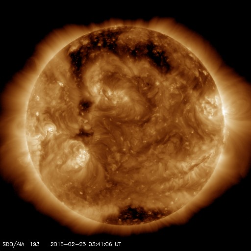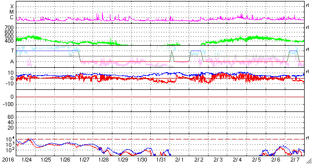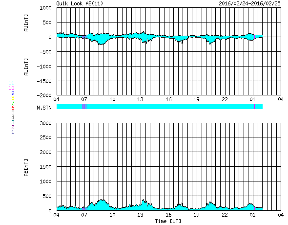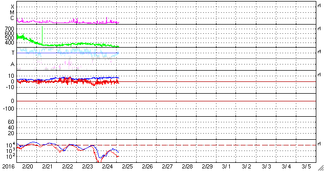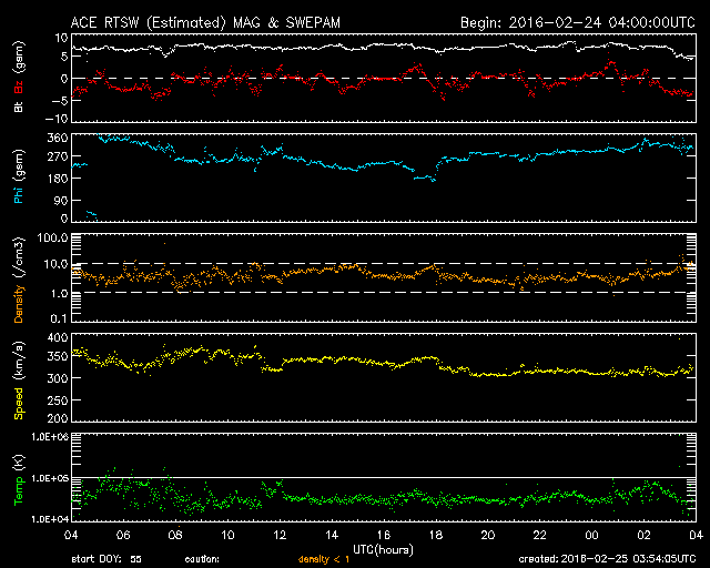 2016/ 2/25 12:55 更新 太陽風は、更に低速になっています。フィンランドのオーロラをどうぞ。 担当 篠原 フィンランド・オウル市の小松兼一さんより、 2月16日に撮影されたオーロラの写真をいただきました。 23日に紹介したムルマンスクのオーロラ写真と同じ夜です。 撮影時刻は、現地21時(世界時19時)の、7分、13分、49分とのことで、 太陽風は、600km/秒の高速風、磁場強度も10nTに強まって、 南北成分は南向きに変化していた頃です。 AE指数も、1000nT前後の大きな変化を記録しています。 小松さんによると、1、2枚めの写真は、 オーロラ自体はあまり強くなかったものの、 月明かりの下で趣のあるオーロラ写真を撮ろうとしたとのことです。 撮り終えて家に帰り着いたときに、 突然大きく発達したオーロラが現れたそうで、 それを撮影したのが3枚めです。 ものの2、3分も経たずに消えてしまったそうで、 一瞬のできごとだったということです。 ニュージーランド(18日掲載)に始まって、ロシア、フィンランドと、 地球を半周するオーロラの旅になりました。 素敵な雰囲気のオーロラ写真を、ありがとうございます。 現在の太陽風は、速度は350km/秒から310km/秒へ下がり、 一段と低速の風になっています。 磁場強度は、7nTで安定していましたが、 グラフの最後のところで、5nTに下がっています。 磁場の南北成分は、0nT付近から、 時々、少し南向きに振れるという変化を繰り返しています。 この変化と対応していると見ていいのか、 AE指数は、200〜300nTと小さい変化ですが、 こちらも少し時間をおきながら、繰り返し発生しています。 太陽は、東側の黒点に、2506群と番号が付きました。 C1.4の小規模フレアを1回起こして、 その後も小さい活動は続いているようです。 規模が大きくなる様であれば、注目する必要が出てくるでしょう。