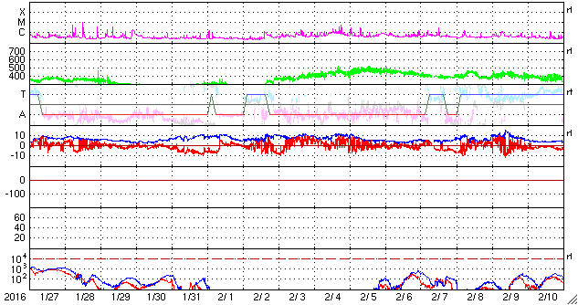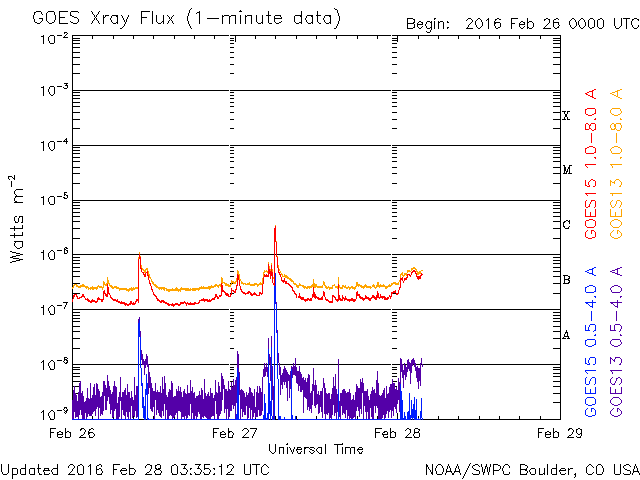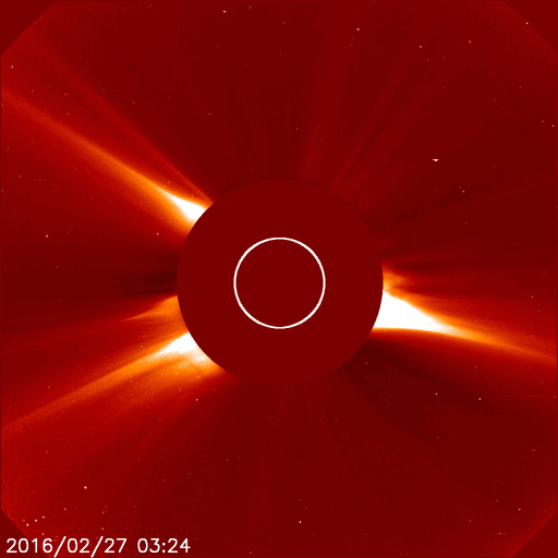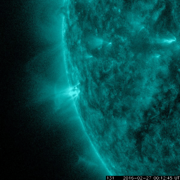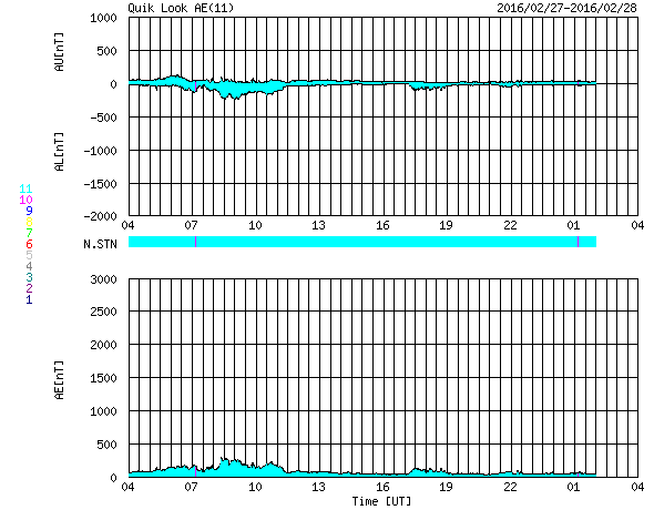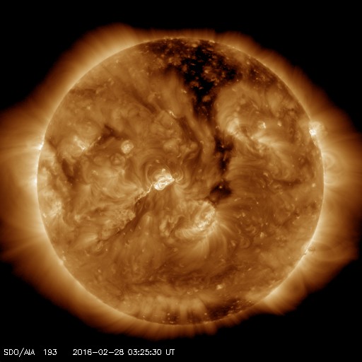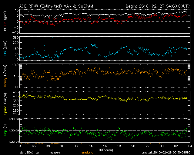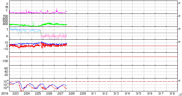 2016/ 2/28 12:36 更新 太陽風はやや低速で、磁気圏は静穏です。 担当 篠原 太陽の中央に見える2506黒点群が少し大きくなり、 C3.3の小規模フレアと、 Bクラスの小さいフレアを数回起こしています。 活動的な状態は続いているようです。 また、太陽の東端(左端)で、27日13時(世界時27日4時)頃に Bクラスの小さいフレアが発生したのですが、 SDO衛星の動画を、AIA131、193、171と、 3種類繋げて掲載します。 数字は、撮影している光の波長を示しています。 それにより、様々な温度のコロナを見ることができます。 (Wikipedia参照) 爆発の様子がいろいろ違って見えて、興味深い動画です。 このフレアに伴って、 CME(太陽ガスの放出現象)も発生しています。 SOHO衛星LASCO C2の動画を掲載します。 横に向かっているので、地球への影響はありません。 太陽風は、370km/秒とやや低速の風が続いています。 磁場強度は、5nTで安定していましたが、 今朝くらいから少し高まって、8nTになっています。 更に上がり続けるのか、この辺りで落ち着くのか、 今後やって来ると思われる、 コロナホールの影響との関係に注目してください。 太陽風磁場の南北成分は、北寄りになっています。 このため、磁気圏は穏やかになっていて、 AE指数はほとんど変化がみられません。 SDO衛星AIA193では、コロナホールが西に進んでいます。 明後日、3月1日くらいから影響がやって来るかもしれません。 ![]() SDO衛星AIA131,193,171による、太陽の東端で発生した小規模のフレア。 (c) SDO (NASA)、 (動画加工 : 宇宙天気ニュース) ![]() 東端のフレアに伴って発生したCMEの噴出。SOHO衛星LASCO C2。 (c) SOHO (ESA & NASA)、 (動画加工 : 宇宙天気ニュース) ![]() SDO衛星のAIA193カメラによる太陽コロナの様子 (c) SDO (NASA) ![]() SDO衛星による太陽の可視光写真。マウスの矢印を写真に重ねると、黒点番号付きの写真に切り替わります。 (c) SDO (NASA) ![]() GOES衛星の太陽X線データ (c) NOAA/SWPC ![]() ACEが観測した太陽風の磁場(1番上の枠、白線は全体の強度、赤線は南北成分) および、太陽風の密度(3番目の橙線)、速度(4番目の黄線) (c) NOAA/SWPC ![]() リアルタイムAE指数 下段のAEグラフの値が高くなると、オーロラ活動が活発化しています。 (c) 京都大学, NICT ![]() 27日の太陽周期に合わせたデータプロット 太陽が同じ面を地球に向けていた27日前の変化から、今後を予想することができます。 (c) 作図:宇宙天気ニュース