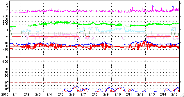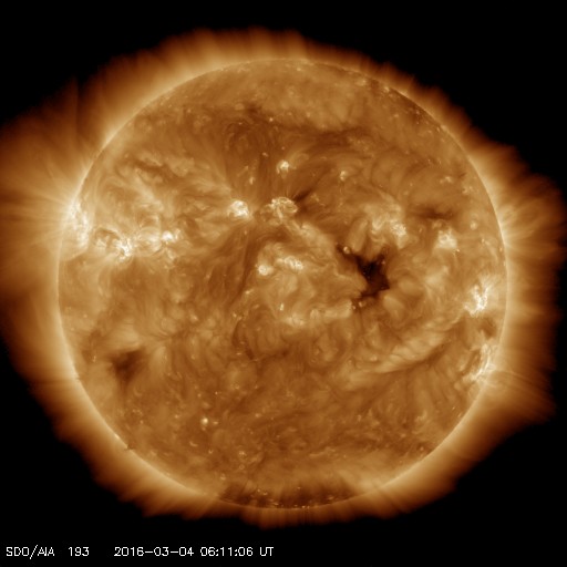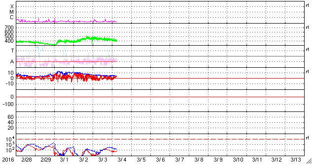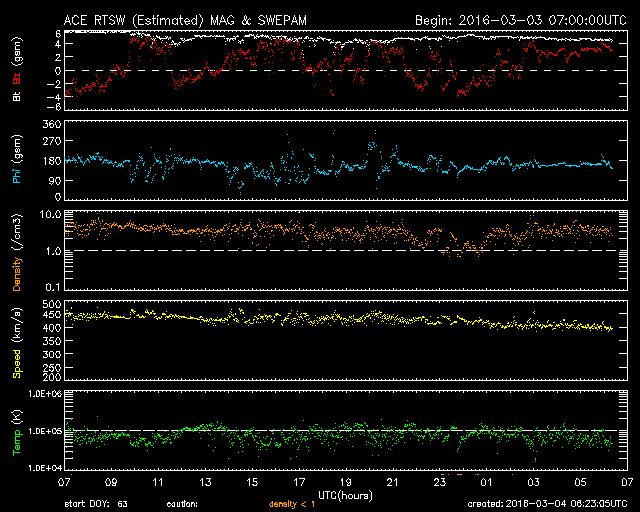 2016/ 3/ 4 15:24 更新 太陽風は平均的な速度に戻っています。太陽は穏やかです。 担当 篠原 太陽風の速度は、昨日から今日にかけてゆっくりと低下し 現在は400km/秒と平均的な速さに戻っています。 磁場強度も、5nTと平均的な状態です。 磁場の南北成分は、北に向いたり、南に向いたり、 ゆっくりと変化しています。 このため、AE指数には、200〜400nTの小規模の変化が、 時間をおいて発生していますが、 比較的穏やかに推移しています。 SDO衛星AIA193の太陽写真では、 中央部のコロナホールが西に進んで、 明日くらいから弱い影響が見られるかもしれません。 太陽は、目立ったフレアの発生はなく、 穏やかな状態が続いています。 ![]() SDO衛星のAIA193カメラによる太陽コロナの様子 (c) SDO (NASA) ![]() SDO衛星による太陽の可視光写真。マウスの矢印を写真に重ねると、黒点番号付きの写真に切り替わります。 (c) SDO (NASA) ![]() ACEが観測した太陽風の磁場(1番上の枠、白線は全体の強度、赤線は南北成分) および、太陽風の密度(3番目の橙線)、速度(4番目の黄線) (c) NOAA/SWPC ![]() リアルタイムAE指数 下段のAEグラフの値が高くなると、オーロラ活動が活発化しています。 (c) 京都大学, NICT ![]() 27日の太陽周期に合わせたデータプロット 太陽が同じ面を地球に向けていた27日前の変化から、今後を予想することができます。 (c) 作図:宇宙天気ニュース