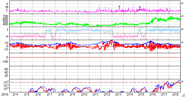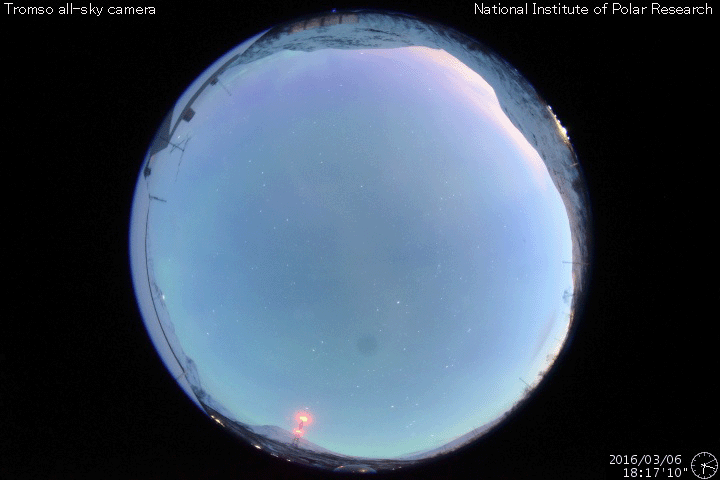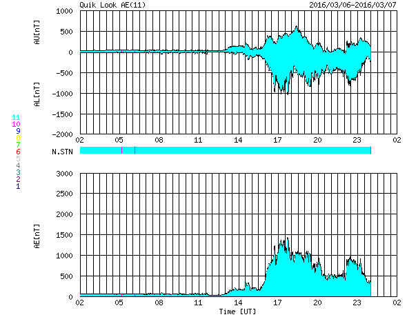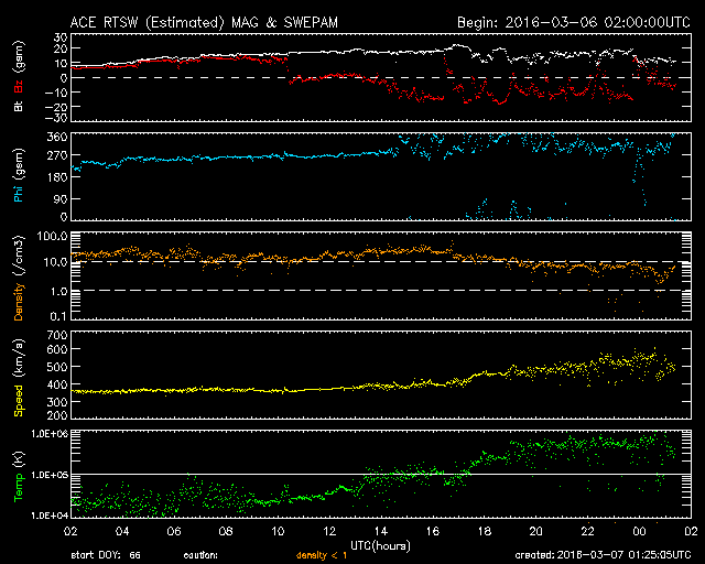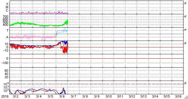 2016/ 3/ 7 10:26 更新 太陽風磁場の南向きが強まり、磁気圏の活動を強めています。速度は500km/秒に上がっています。 担当 篠原 太陽風の乱れが強まっています。 昨日より高まっていた磁場強度は、 今日の未明に、20nTまで高まりました。 その後、15〜20nTを推移して、今朝になって10nTへ少し下がっています。 磁場の変化を追いかけるように、速度も上昇を始め、 昨日は400km/秒を割っていましたが、 深夜に400km/秒を超えて、その後、550km/秒まで高まっています。 また、注目していた磁場の南北成分は、 今日に入った頃から南向きに振れるようになりました。 磁場強度が高まったこともあり、-15nTと強く南向きに振れました。 このため、磁気圏の活動は一気に高まっています。 AE指数のグラフは、 磁場がまだ南に振れていなかった前半は、ほとんど変化していませんが、 後半から急に大きく変化を始め、 1000〜1300nTと大規模の変化も発生しています。 この少し後ですが、世界時6日19〜21時頃のオーロラの様子を、 ノルウェー・トロムソの全天カメラの動画で紹介します。 空が暗くなっていくとともに、オーロラの光が強く見える様になり、 より上空の赤いオーロラも強く輝いています。 ファイルサイズが大きめですが、じっくりとご覧下さい。 Dst指数の速報値は、 -96nTまで下がっています。 中規模の磁気嵐となっているようです。 現在の太陽風は、500km/秒の高速風で、 磁場も10nTに強まった状態です。 南向きの磁場は弱くなっているので、変化は弱まりそうですが、 引き続きオーロラの活動に注目して下さい。 太陽は、目立ったフレアは発生していませんが、 2512黒点群で小さい活動が頻繁に起きています。 発達してCクラスに届くようになるでしょうか。