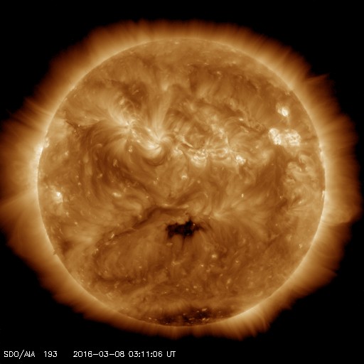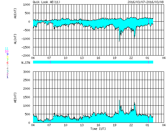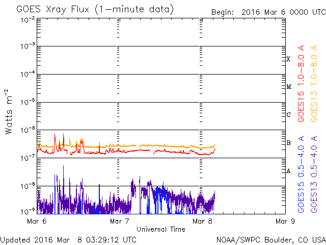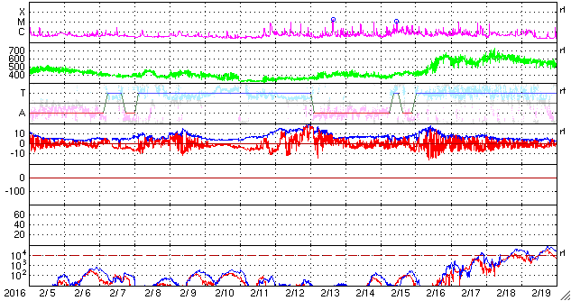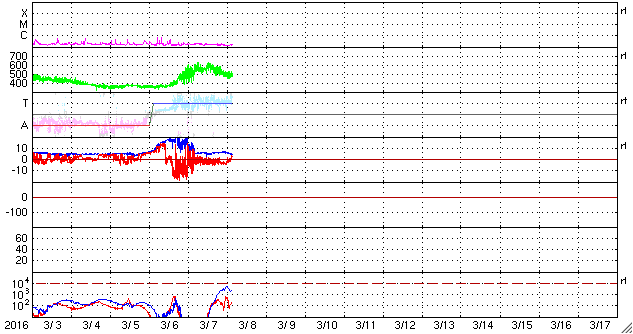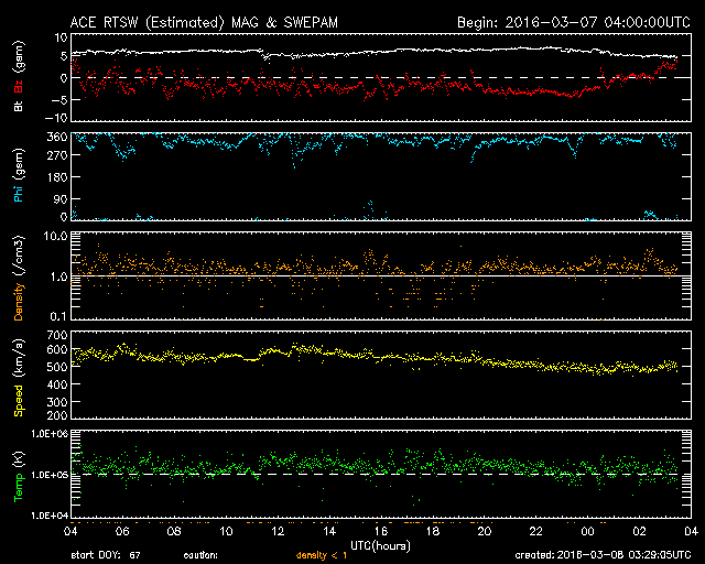 2016/ 3/ 8 12:29 更新 太陽風の高まりは後半に入っています。ニュージーランドのオーロラをどうぞ。 担当 篠原 ニュージーランド南島クィーンズタウンの米戸 実さんより、 現地7日5時半から6時過ぎ(世界時6日16時半から17時過ぎ)にかけて 撮影されたオーロラの写真をいただきました。 昨日掲載したトロムソのオーロラ写真の少し前、 昨日のAE指数のグラフで、最も高くなっていた頃のオーロラです。 米戸さんによると、 現地3時半に太陽風の磁場が南向きに強まったのを見て家を出て、 晴れ間を求めて内陸へ向かい、撮影に成功したとのことです。 1〜3枚めは、暗い時間の撮影だったそうですが、 4、5枚目は、薄明が始まっていたそうです。 そして、現地5時頃までは、 赤いオーロラが地平線すれすれに見える程度だったのが、 その後、白い火柱が昇るようになって、 このような写真を撮ることができたとのことです。 大小のマゼラン雲と赤いオーロラの対比がものすごい迫力です。 昨日のトロムソでは、夕暮れとともにオーロラが強まりましたが、 ほぼ反対側のニュージーランドでは、 夜明け直前にオーロラが強まっていたようです。 素晴らしい写真をありがとうございます。 太陽風の高まりは、後半に入っている様です。 磁場強度は、昨日のニュースのすぐ後に5nTへ急に下がり、 現在まで続いています。 速度は、600km/秒まで達しましたが、 今日に入った頃からゆっくりと低下して、 現在は500km/秒と、高速状態は続いていますが、 大きな高まりではなくなっています。 27日周期の図を見ると分かりやすいですが、 今回の太陽風の高まりは、比較的短い期間で終わるかもしれません。 太陽風磁場の南北成分は、 今朝までは南寄りの傾向が続いていました。 このため、磁気圏の活動も高まった状態が続き、 AE指数は、全体的に500nTの変化が連続し、 1000nTを超える大きな変化も2回発生しています。 しかし、ACE衛星のグラフの最後で、 磁場は北向きに切り替わっています。 この傾向が続くのであれば、磁気圏の活動の高まりはここまでで、 以降は穏やかになるでしょう。 太陽は、フレアの発生はありません。 GOES衛星のX線のグラフは、ほとんど変化が見られません。