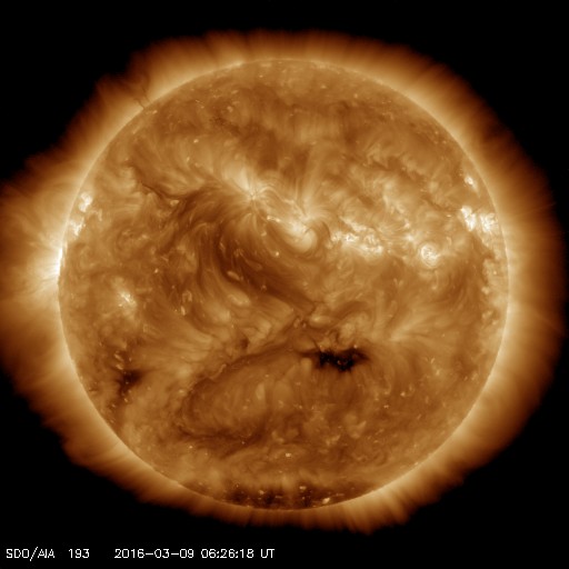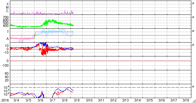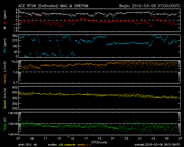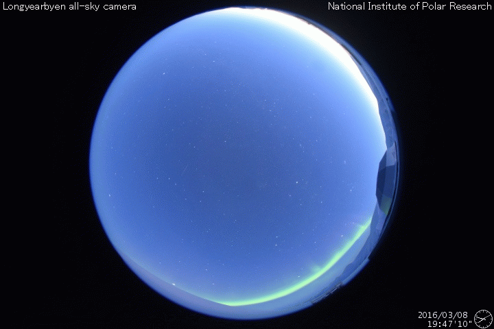 2016/ 3/ 9 15:31 更新 太陽風は平均的な状態に戻っています。C1の小さいフレアが起きています。 担当 篠原 太陽風の速度は、昨日のニュース以降も低下が続き、 500km/秒の高速風から、 現在は400km/秒と平均的な状態に戻っています。 磁場強度は、3〜4nTとやや弱くなっています。 太陽風の高まりは、3日程度で終わりました。 太陽風磁場の南北成分は、弱い南向きになっています。 このため、磁気圏では小中規模の活動が起きていて、 AE指数は300〜500nTの変化が続いています。 このグラフでは変化は小さくなっていますが、 世界時8日20〜22時頃のオーロラの様子を、 ノルウェー・Longyearbyenの全天カメラの動画で紹介します。 夜の時間がだいぶ短くなっているようで、 撮影が行われるのはもうしばらくとなりそうです。 SDO衛星AIA193の太陽の中央部、 中央を少し過ぎたあたりに小さいコロナホールが見えています。 規模が小さいですが、2〜3日後に弱い影響がやってくるかもしれません。 太陽は、2511黒点群でC1.5、東端でC1.3と 小規模のフレアが2回発生しています。 東端から、どのような領域が姿を表すでしょうか。 ![]() ノルウェー・スバールバル島のLongyearbyenで、世界時8日20〜22時に撮影されたオーロラ。 (c) 国立極地研究所、(動画加工 : 宇宙天気ニュース) ![]() SDO衛星のAIA193カメラによる太陽コロナの様子 (c) SDO (NASA) ![]() SDO衛星による太陽の可視光写真。マウスの矢印を写真に重ねると、黒点番号付きの写真に切り替わります。 (c) SDO (NASA) ![]() ACEが観測した太陽風の磁場(1番上の枠、白線は全体の強度、赤線は南北成分) および、太陽風の密度(3番目の橙線)、速度(4番目の黄線) (c) NOAA/SWPC ![]() リアルタイムAE指数 下段のAEグラフの値が高くなると、オーロラ活動が活発化しています。 (c) 京都大学, NICT ![]() 27日の太陽周期に合わせたデータプロット 太陽が同じ面を地球に向けていた27日前の変化から、今後を予想することができます。 (c) 作図:宇宙天気ニュース
