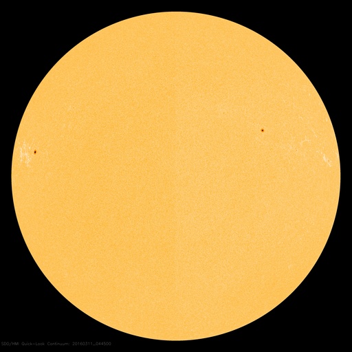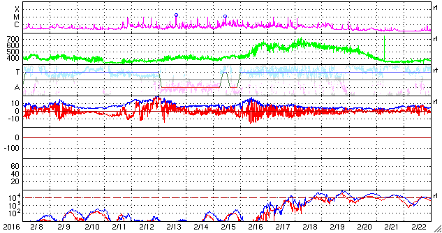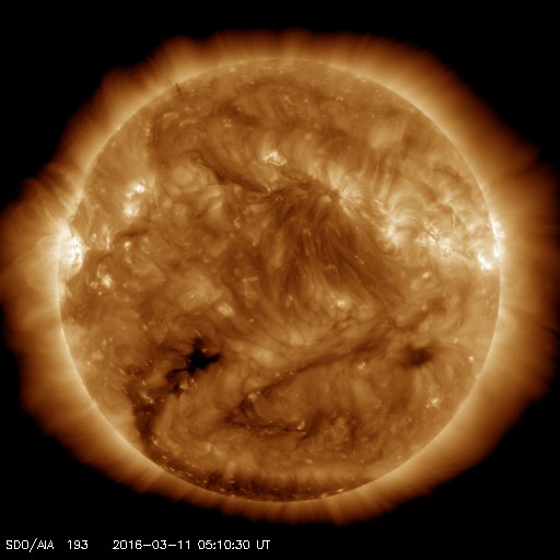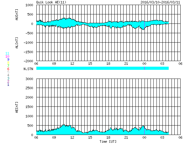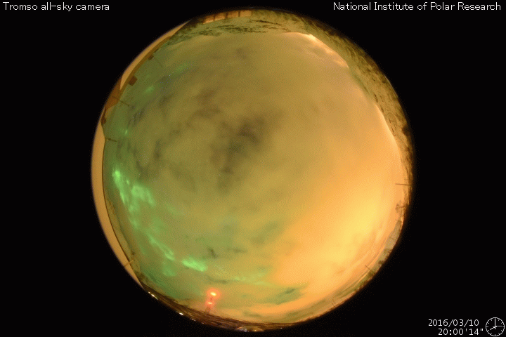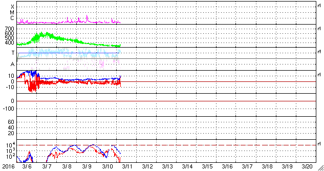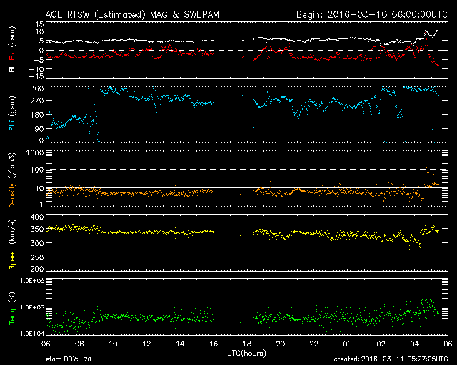 2016/ 3/11 14:28 更新 太陽風は低速ですが、磁場が南寄りのため磁気圏の活動が続いています。 担当 篠原 太陽風は、350km/秒と低速の風が続いています。 磁場強度は、昨日のニュースの後に5nTへ少し上がり、 そのまま安定していました。 そして、先ほどより、磁場は8nTへさらに強まりを見せています。 コロナホールの影響がやってきたのか、一時的な変化なのか、 引き続き注目してください。 太陽風磁場の南北成分は、弱い南寄りが続いています。 このため、磁気圏では弱い活動が続いているようです。 AE指数のグラフは、200〜500nTの小規模の変化が、 連続的に発生しています。 この中の、世界時10日20〜22時のオーロラの様子を、 ノルウェー・トロムソの全天カメラの動画で紹介します。 薄雲を通しての撮影ですが、オーロラが何度も明るく輝いています。 この後、磁場が強まって、南向きに大きく振れると、 磁気圏の活動はより高まります。 ACE衛星のデータとともに、ライブカメラにも注目してください。 太陽は、Cクラスに達する活動は起きていません。 東橋の2519群も、静かです。