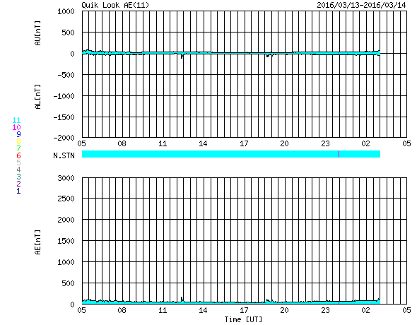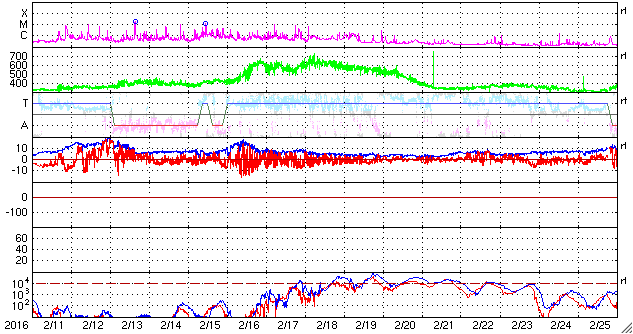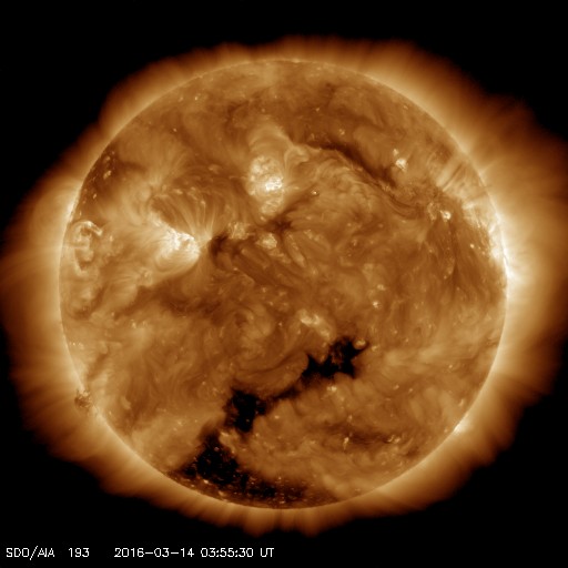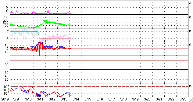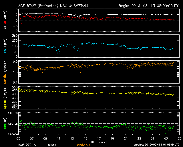 2016/ 3/14 13:09 更新 太陽風は平均的な状態で、磁気圏は静穏です。 担当 篠原 太陽風の速度は、450km/秒から400km/秒に下がり、 平均的な状態に戻っています。 磁場強度も、5nTで安定しています。 磁場の南北成分は、0nTから北向きでほとんど推移しています。 このため、磁気圏はとても穏やかで、 AE指数のグラフには、ほとんど変化が見られません。 SDO衛星AIA193の太陽写真では、 コロナホールが中央線を越えて、西に少し進んでいます。 地球への影響の到来は、明後日くらいでしょうか。 太陽では、今朝、14日4時(世界時13日19時)に、 東端近くでフィラメント噴出が発生しています。 SDO衛星AIA193による動画を掲載します。 暗く見えるコロナのガスが、勢いよく噴き上がっています。 この現象により、CME(太陽ガスの放出現象)も発生していますが、 地球からは横に向かっているので、影響はありません。 太陽では、フレアの発生は特になく、 全体としては穏やかな状態です。 ![]() 太陽の東端で発生した、フィラメント噴出の様子。SDO衛星AIA193。 (c) SDO (NASA)、 (動画加工 : 宇宙天気ニュース) ![]() SDO衛星のAIA193カメラによる太陽コロナの様子 (c) SDO (NASA) ![]() SDO衛星による太陽の可視光写真。マウスの矢印を写真に重ねると、黒点番号付きの写真に切り替わります。 (c) SDO (NASA) ![]() ACEが観測した太陽風の磁場(1番上の枠、白線は全体の強度、赤線は南北成分) および、太陽風の密度(3番目の橙線)、速度(4番目の黄線) (c) NOAA/SWPC ![]() リアルタイムAE指数 下段のAEグラフの値が高くなると、オーロラ活動が活発化しています。 (c) 京都大学, NICT ![]() 27日の太陽周期に合わせたデータプロット 太陽が同じ面を地球に向けていた27日前の変化から、今後を予想することができます。 (c) 作図:宇宙天気ニュース