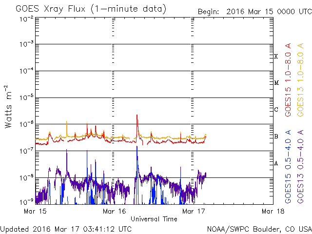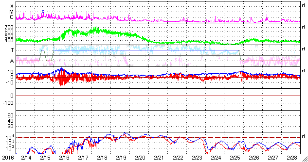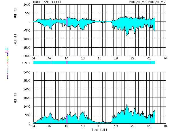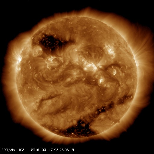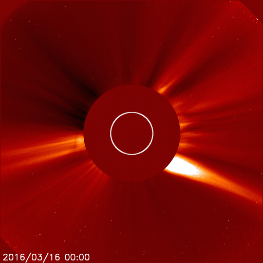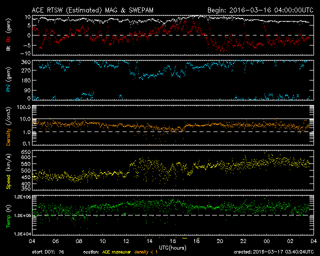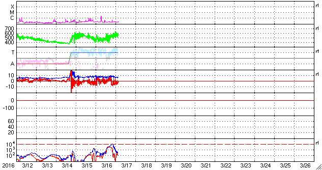 2016/ 3/17 12:41 更新 高速の太陽風が続いています。磁気圏も活動的です。 担当 篠原 太陽風の速度は、昨日のニュースの後に、 再び450km/秒へ下がってしまったのですが、 夜になるとゆっくりと上昇を始めて、 550km/秒の高速状態に戻っています。 27日周期の図の速度変化を見ると、 3月14日と16日に2つの高まりができていて、 前周期の変化と似た姿になっています。 太陽風の磁場強度は、7〜10nTの間を推移しています。 強まった状態は続いているので、 引き続き、速度の推移についても注意が必要のようです。 磁場の南北成分は、比較的南寄りに推移しています。 速度が高いこともあって、磁気圏の活動は活発になっていて、 AE指数のグラフは、500〜1000nTの中規模の変化が ほぼ1日中続いています。 極域では、賑やかにオーロラが現れているのではないでしょうか。 SDO衛星AIA193を見ると、 南半球のコロナホールが西へ通り過ぎていくのに続いて、 今度は、北半球のコロナホールが太陽の中心線へ近づいています。 4日ほどすると、こちらの影響が地球へ及ぶようになるかもしれません。 太陽では、東端から新しい黒点が現れ、 2524黒点群と番号が付いています。 今の所、目立った活動は起こしていませんが、しばらく注目して下さい。 また、西の端に達した2522群で、C2.2の小規模フレアが発生し、 その変化に伴って、CMEも噴出しています。 SOHO衛星LASCO C2、C3の動画を掲載します。 噴き出していく様子が、なかなかダイナミックです。 地球からは横に向かっているので、影響はないでしょう。 また、高速太陽風の影響を受けて、 放射線帯の高エネルギー電子が増加しています。 GOES15の青線が、10,000の線に達したところです。 更に増加が続く可能性があります。