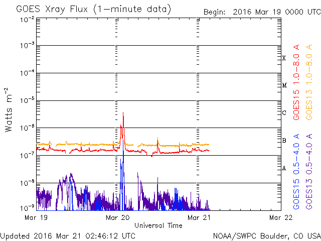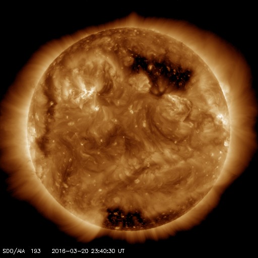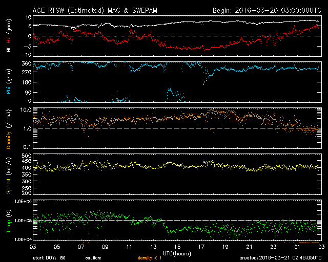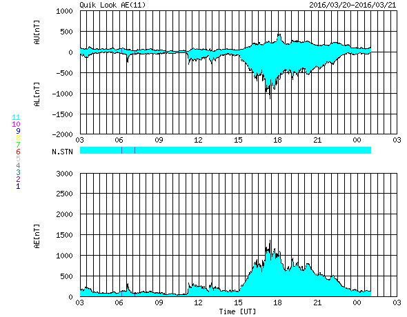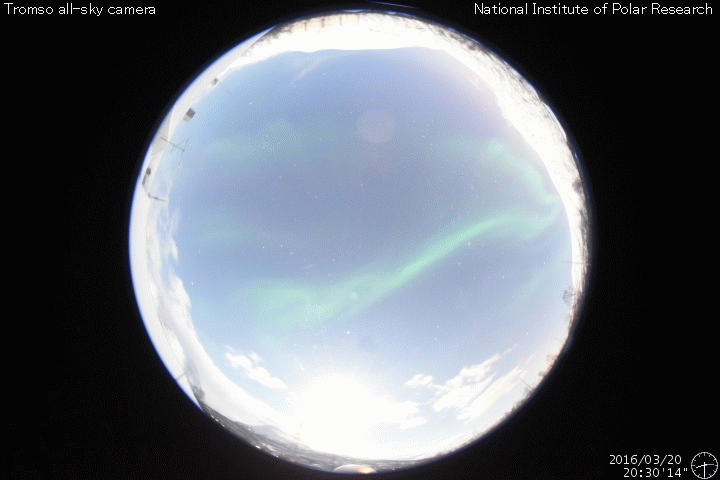 2016/ 3/21 12:00 更新 太陽風磁場が南向きに強まり、磁気圏の活動を強めました。 担当 篠原 太陽風は、400〜420km/秒と平均的な速さで安定しています。 磁場強度は、昨夕までは5nTで安定していましたが、 その後、7nTに少し高まって、現在まで続いています。 磁場の南北成分が特徴的な変化をしています、 磁場が強まるとともに、南向きに大きく変化して、 -5nTを超えるくらいに高まった南向きの磁場が、 6時間ほど続きました。 この影響で、磁気圏の活動も一段高まって、 AE指数のグラフは、 中盤から1200nTに達する大きな変化が発生しています。 変化のピークを少し過ぎた頃の様子ですが、 ノルウェー・トロムソの全天カメラによるオーロラの動画を掲載します。 月が明るく、空の条件はかなり悪いですが、 夜空を東西に横切って、オーロラが躍動しています。 磁場の南北成分は、今朝くらいから北向きに切り替わり、 現在は+5nTくらいです。 このため、磁気圏の活動は現在は穏やかになっているでしょう。 太陽の北半球のコロナホールは、さらに西に進み、 そろそろ影響が始まるかもしれません。 引き続き、太陽風の様子に注目してください。 太陽は、昨日のC3フレア以降は特に活動はなく、 穏やかになっています。 今日は東京に来ています。 この後、午後の飛行機でフランスへ向かいます。 今週いっぱいは更新が不定期になります。 臨時サーバーからの復帰も、現地に着いてから挑戦します。 引き続きご不便をおかけして、申し訳ありません。