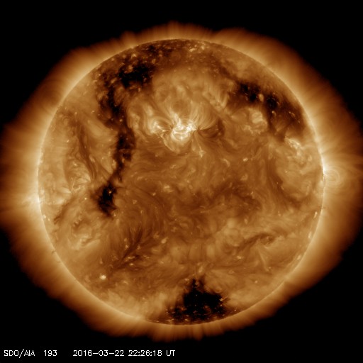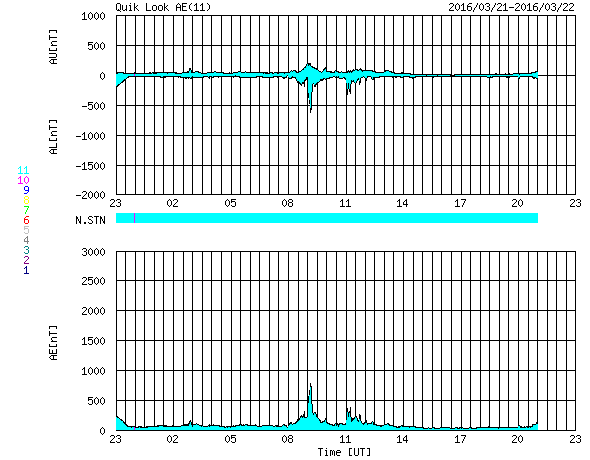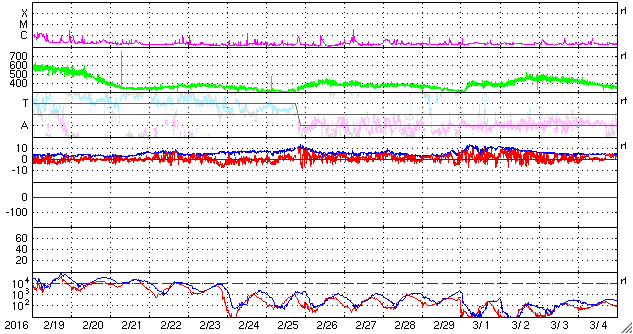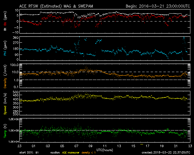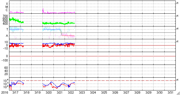 2016/ 3/23 07:38 更新 太陽風は穏やかで、磁気圏も静穏です。太陽も穏やかです。 担当 篠原 太陽風の速度は、400〜430km/秒と平均的な状態で推移しています。 磁場強度は、5〜7nTと少し強まっていますが、 目立つほどの変化ではなく、 太陽風は、全体としては穏やかな風が続いています。 SDO衛星AIA193では、 北半球のコロナホールはだいぶ西に通り過ぎました。 このまま、特に影響は見られないかもしれません。 磁場の南北成分は、北寄りの傾向が続いています。 ただ、時々南向きに変化して、 磁気圏の活動を一時的に起こしているようです。 AE指数には、小規模の変化が2回ほど起きています。 太陽は、目立った活動はなく、静かな状態が続いています。 サーバーの復帰作業を行っていますが、 ホテルの回線が細くて、苦労しています。 この記事が公開できれば、作業はなんとか完了したことになります。 今日はフランス南部のモンペリエにいますが、 天気が良くて比較的暖かく、過ごし易い一日でした。 明日は午後からトゥールーズに移動します。