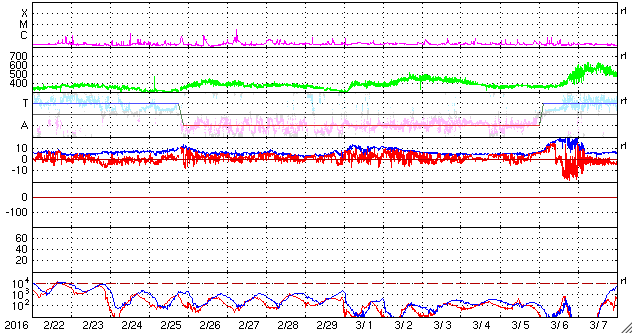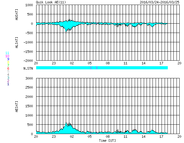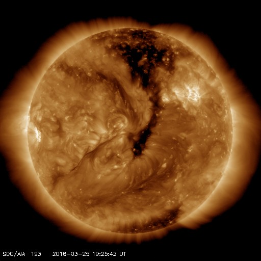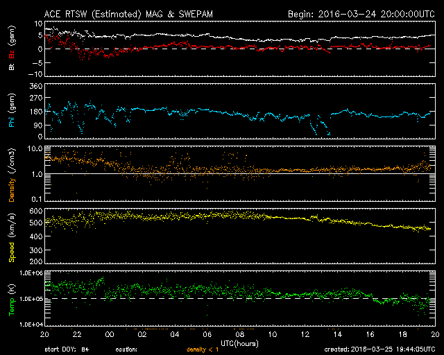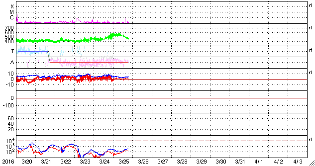 2016/ 3/26 04:44 更新 太陽風速度の高まりは終わりに向かっています。太陽は穏やかです。 担当 篠原 太陽風速度の高まりは、 昨日のニュースの頃の550km/秒がピークだったようで、 その後は低下に向かい、現在は460km/秒まで下がっています。 まだ、やや高速の状態ですが、 太陽風速度の高まりは短期間で終わりそうです。 太陽風の磁場強度は、ACE衛星のグラフの後半は、 5nT付近と平均的な状態が続いています。 南北成分は、0nT付近で小さく変化していますが、 AE指数は、グラフの後半も小さい変化がいくらか見られています。 SDO衛星AIA193の太陽写真では、 北半球を南北に伸びるコロナホールが、太陽の中心線を通過しています。 2日後くらいから、影響がやってくる可能性があります。 太陽は、目立った活動はなく、穏やかな状態が続いています。 パリの空港で記事を書いています。 これから搭乗します。 鹿児島へ戻れるのは日曜日で、来週からは通常の更新に戻れます。