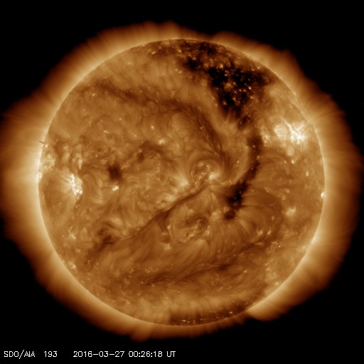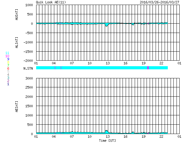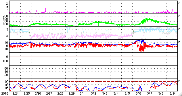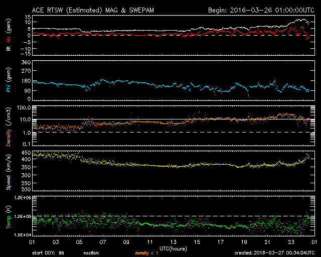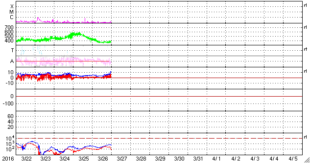 2016/ 3/27 09:32 更新 太陽風速度は低速になっていますが、磁場強度がやや強まっています。 担当 篠原 太陽風の速度は、さらに低下が続いて、 昨夜には360km/秒まで下がりました。 磁場強度も、5nTを割るくらいに弱くなりましたが、 今日に入ると逆に高まり始め、 今朝、27日8時(世界時26日23時)には、12nTへ達しています。 SDO衛星AIA193の太陽写真では、 北半球に広がるコロナホールが、西にだいぶ進み、 地球へ影響が及び始める目安の位置に近づいています。 この後、太陽風の速度も上昇を始めるのでしょうか。 ACE衛星の図の最新(右端)では、 速度が急に420km/秒ほどに上がっています。 今後の推移に注目してください。 太陽風磁場の南北成分は、北寄りの傾向が続いています。 このため、磁気圏の活動は穏やかで、 AE指数のグラフにはほとんど変化が見られません。 しかし、磁場が強まっているので、 南北成分の傾向が南向きに切り替わると、 強い南向き磁場によって、磁気圏の活動を高める可能性があります。 速度の変化とともに、磁場の南北成分の様子にも注目してください。 太陽は、フレアの発生は特になく、静かな状態が続いています。 昨夕、無事に帰国しました。 しかし、鹿児島への乗り継ぎまではできず、 これから鹿児島へ帰ります。 桜の花がどうなっているか、 一週間経った春の様子を見るのが楽しみです。