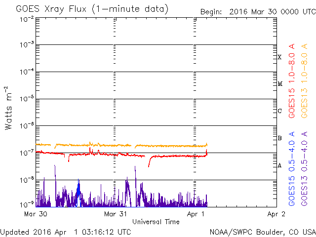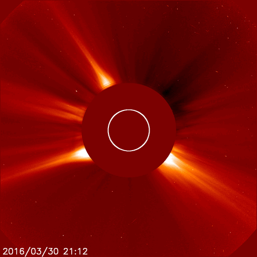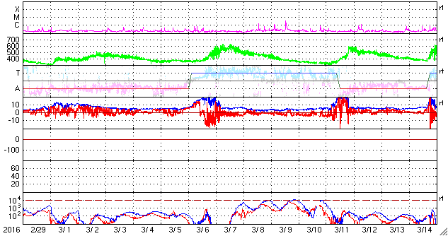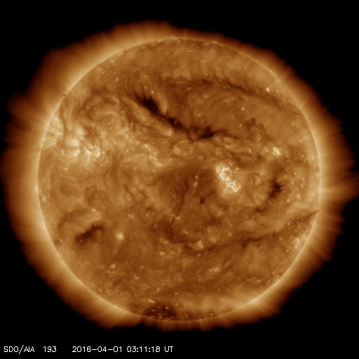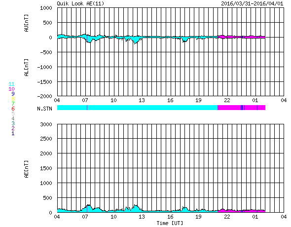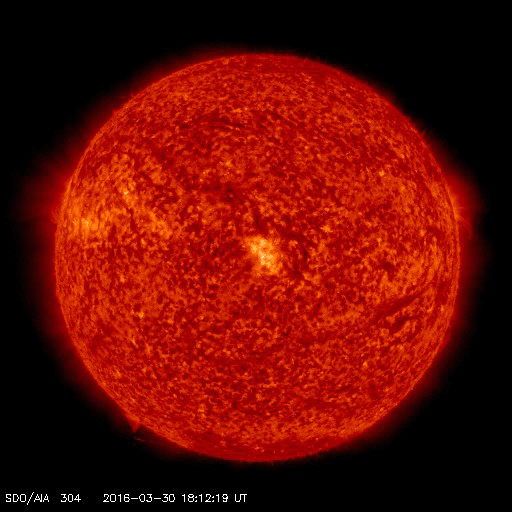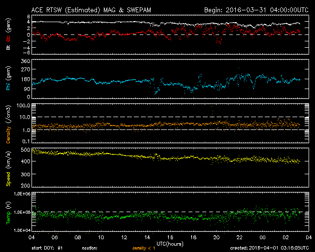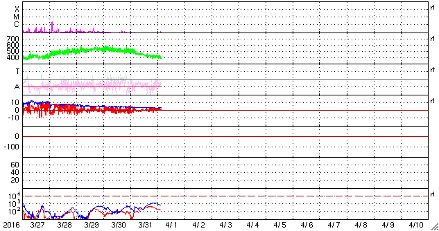 2016/ 4/ 1 12:16 更新 太陽風の速度は400km/秒に下がり、太陽風の高まりは終わりました。 担当 篠原 昨日紹介した、太陽の南西部(右下)で発生した フィラメント噴出の様子を動画で紹介します。 1枚目は、SDO衛星AIA304による撮影です。 暗く弓状に見えているダーク・フィラメントが、 弾けるように外側へ向かって飛び出しています。 噴出の見え方は見事ですが、現象としては小規模だったようで、 2枚目の動画のSOHO衛星LASCO C2によると、 CME(太陽ガスの放出現象)は、C2で淡く見える程度でした。 方向も右下に向かっていて、地球への影響はありません。 太陽では、その後も目立った活動はなく、 静かな状態が続いています。 黒点も、中央部に2526群がぽつんと見えているだけです。 太陽風は、昨日のニュース以降、速度がゆっくりと下がって、 現在は400km/秒と平均的な速さに戻っています。 磁場強度も、4nTから3nTへ、少し弱くなっています。 磁場の南北成分は、グラフの後半から弱い北寄りになっています。 このため、AE指数のグラフは、前半の変化も小さくなっていますが、 後半はほとんど変化がなくなっています。 太陽風の高まりの終わりとともに、磁気圏も静かになっています。 27日周期の図を見ると、 前周期の3月6日に太陽風の高まりが始まっています。 この変化に関係する可能性のあるコロナホールは、 現在はだいぶ小さくなっています。 今日のSDO衛星AIA193の写真で、 赤道域の西側(右側)寄りに見える、小さい領域です。 今回は、太陽風の変化は弱くなっているかもしれません。 前周期と比較しながら、週末にかけて変化に注目してください。
