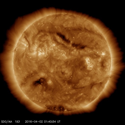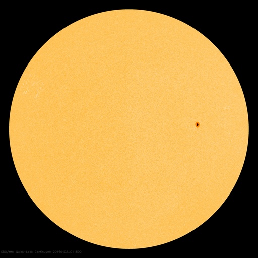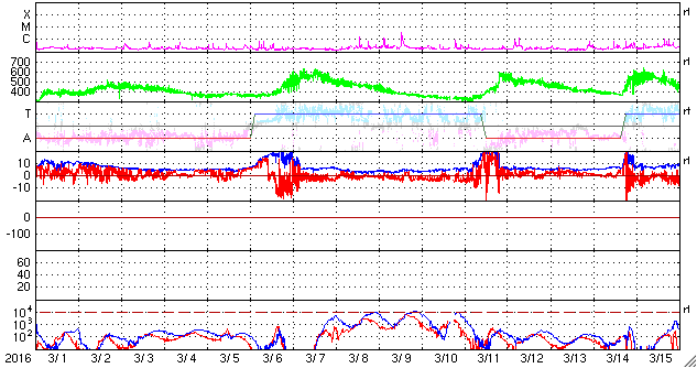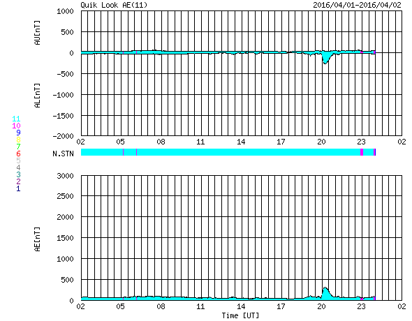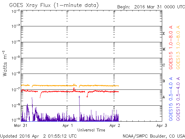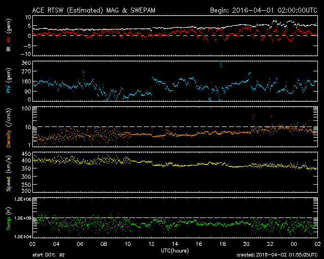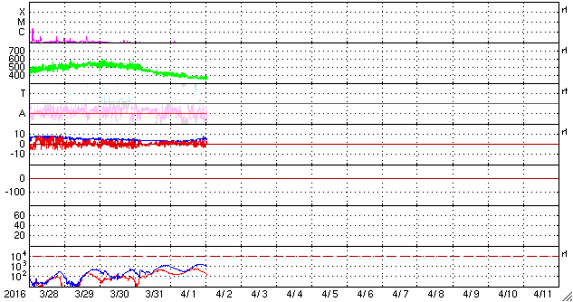 2016/ 4/ 2 10:55 更新 太陽風は低速の風になっています。太陽はとても静かです。 担当 篠原 太陽風の速度は、400km/秒から350km/秒へ下がり、 太陽風は低速の風になっています。 一方、磁場強度は3nTから5nTに上がり、 平均的な状態に戻っています。 磁場の南北成分は、小幅に変化する程度で、 速度が下がってきたこともあり、磁気圏は穏やかです。 オーロラの活動度を示すAE指数のグラフは、 後半にひとつ、小さい変化がある程度です。 太陽風は穏やかになっていますが、 27日周期の図の前周期、3月6日から始まる太陽風の高まりが、 これから回帰してくるかもしれません。 ただし、今回はコロナホールが小さくなっているので、 小さい変化がやってくる程度になるかもしれません。 太陽は、今日も2526黒点群がぽつんと見えているだけです。 X線グラフも全く変化がなく、とても静かな太陽です。