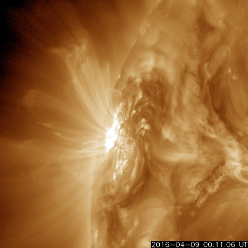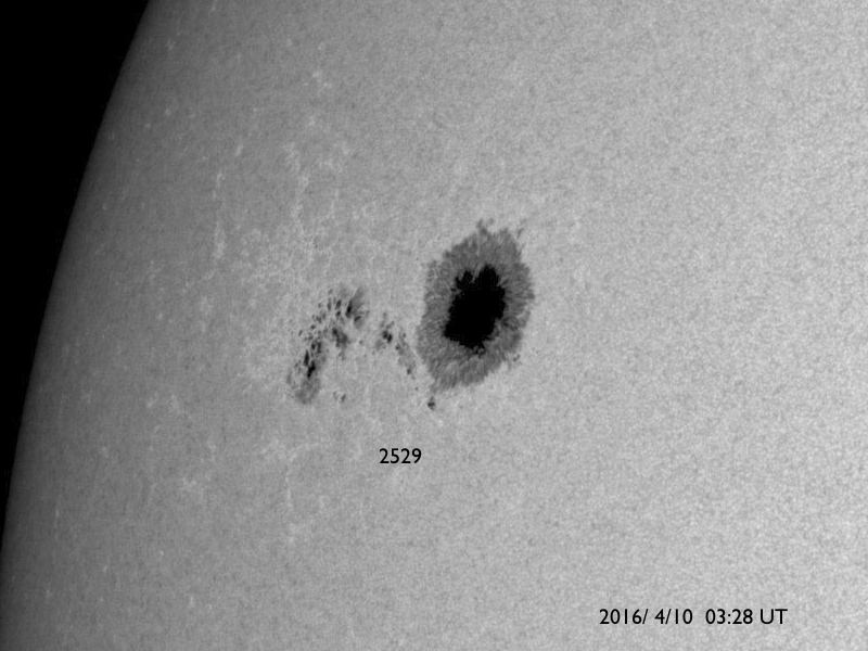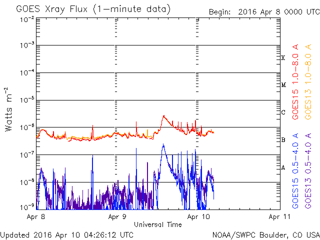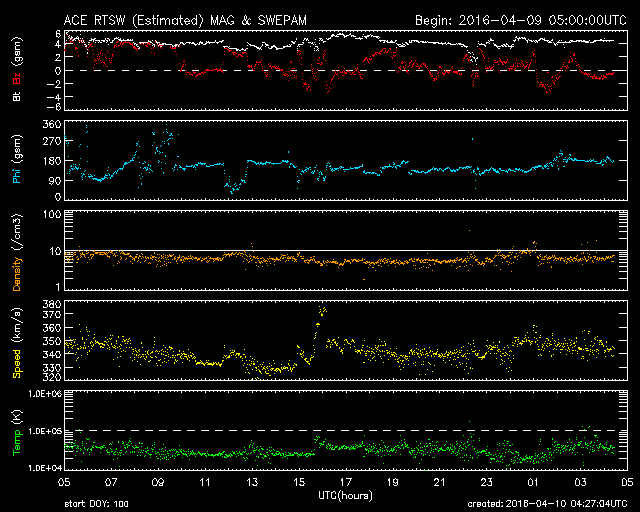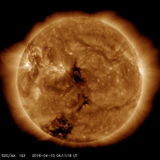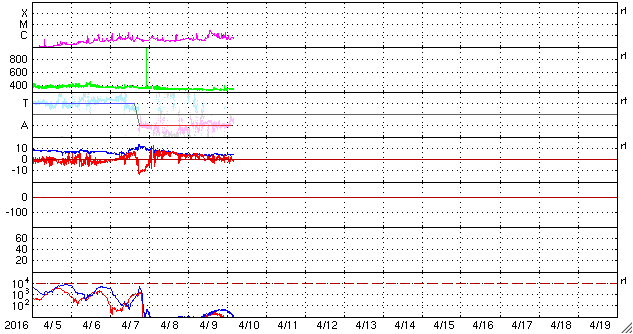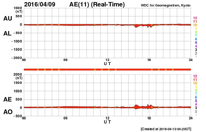 2016/ 4/10 13:26 更新 C1の小さいフレアが続いています。太陽風は低速です。 担当 篠原 2529黒点群の活動度が、少し上がっています。 昨夜、9日21時(世界時9日12時)に、C2.8の小規模フレアを起こし、 その後、C1台の小さいフレアを、今朝にかけて7回起こしています。 SDO衛星AIA193による2529群の動画を掲載します。 規模の小さいフレアばかりですが、 動画では、小さい爆発が次々に起きています。 X線グラフでは、活動が強まる様子は特に見られませんが、 引き続き注目して下さい。 太陽風は、低速の穏やかな状態が続いています。 速度は、340km/秒で安定し、 磁場強度も、4〜5nTと平均的な値です。 磁場の南北成分は、0nT付近です。 磁気圏は穏やかで、AE指数には目立った変化は起きていません。 SDO衛星AIA193では、 赤道域のコロナホールが太陽の中心に達しています。 3日後くらいから、太陽風の高まりがやって来る可能性があります。