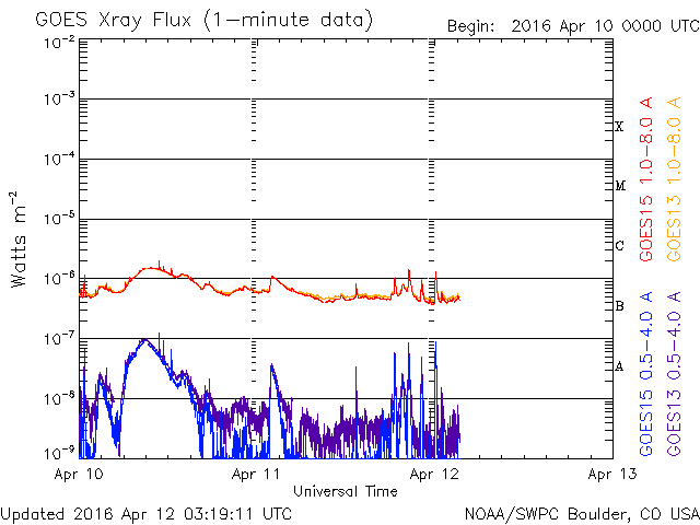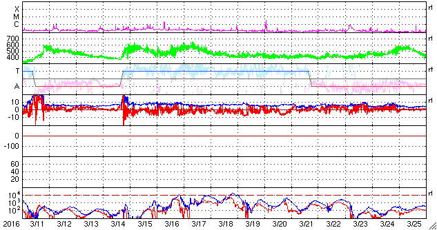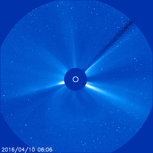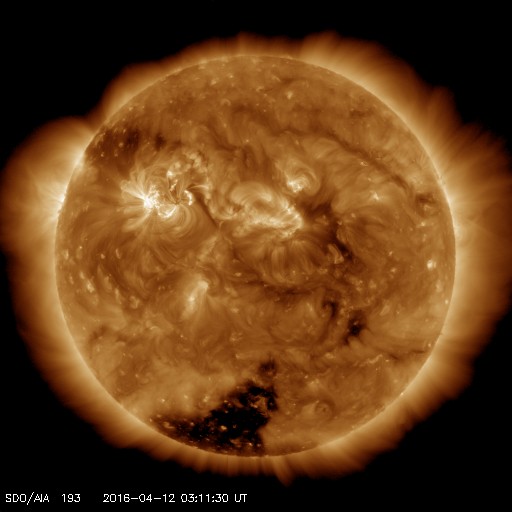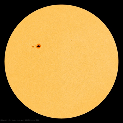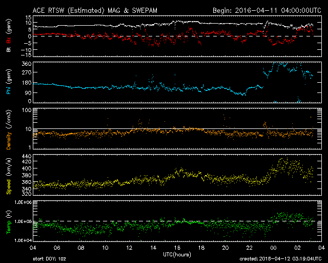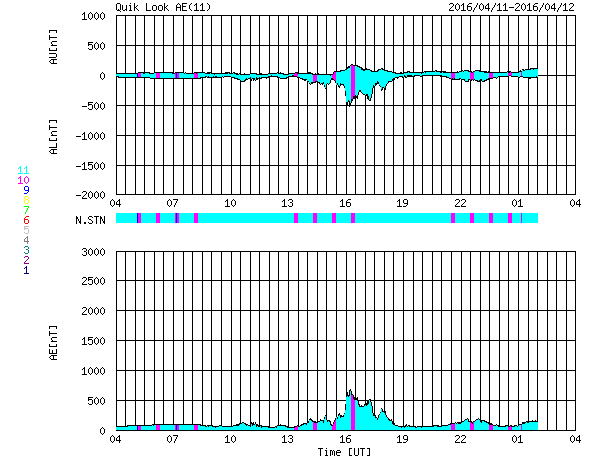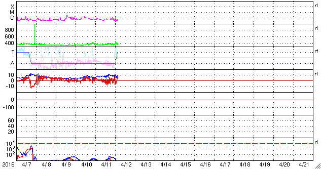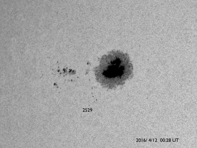 2016/ 4/12 12:19 更新 C1の小さいフレアが数回発生しています。太陽風は低速です。 担当 篠原 昨日紹介した、太陽の北東側で発生したフィラメント噴出による CME(コロナ質量放出:太陽ガスの放出現象です)の様子を、 SOHO衛星LASCO C3の動画で紹介します。 発生地点そのままに、ガスは左上を中心に広がっています。 地球方向への影響は微妙な見え方で、 やって来ても小規模の変化になりそうです。 到来は3〜4日後と考えると、 明日、13日の夜から、14日にかけてとなりそうです。 太陽では、2529黒点群の活動がやや高まっていて、 C1の小さいフレアを4回ほど起こしています。 2529黒点群の拡大写真を掲載しますが、 黒点が、かなり大きく広がっています。 鹿児島では、昨日の午後に晴れ間が広がったので、 日食グラスを使って太陽を見たところ、 肉眼で2529群を見つけることができました。 (今は薄雲のため、まだ見つけていません) 太陽観測用(日食観測用など)の減光フィルターをお持ちでしたら、 ぜひ見つけてみて下さい。 太陽風は、磁場強度が7〜10nTと高まった状態が続いています。 速度は、360km/秒前後と遅い状態で推移して、 グラフの最後に400km/秒近くへ上がる変化をしています。 27日周期の図を見ると、セクターの切り替わりが来たようです。 この後、コロナホールの影響が来るのかどうか、 引き続き注目して下さい。 磁気圏は、基本的には穏やかで、 太陽風磁場の変化によって、 一時的にAE指数の高まりが発生していている程度です。