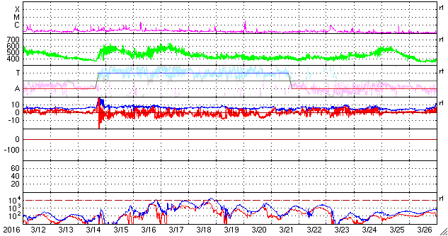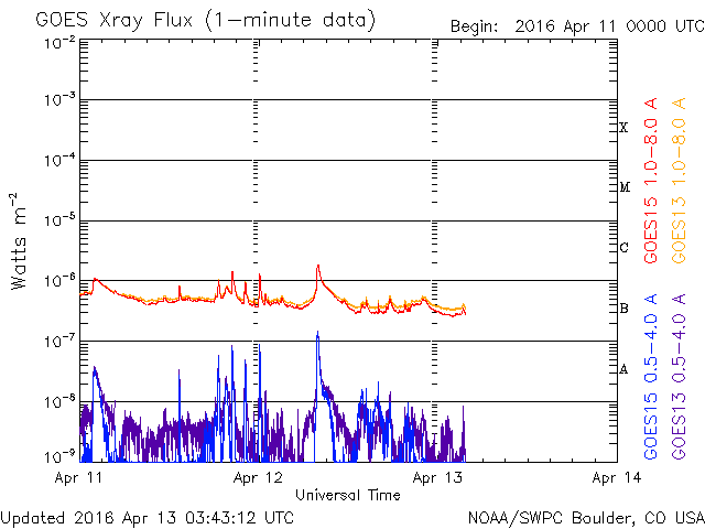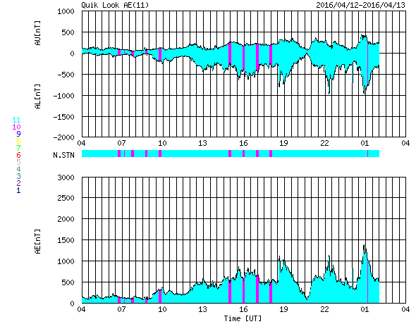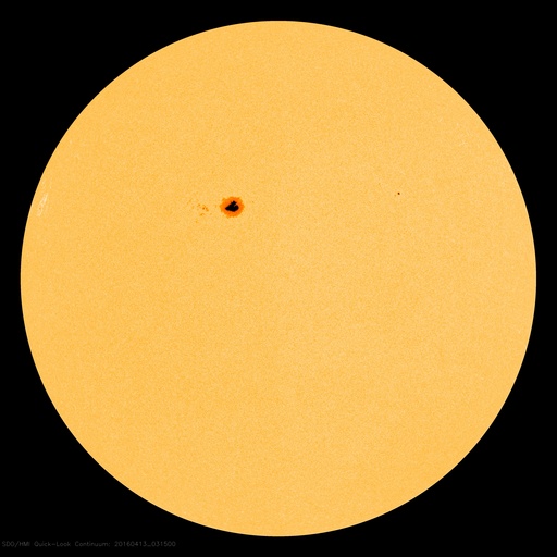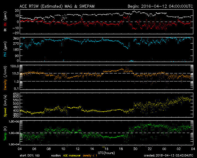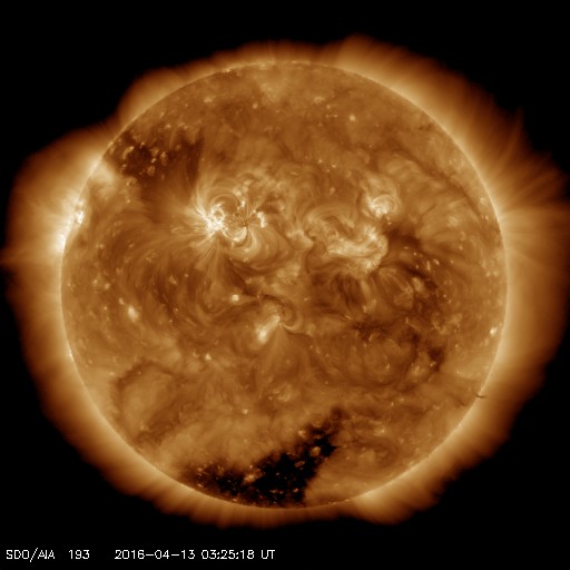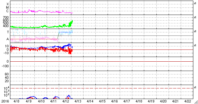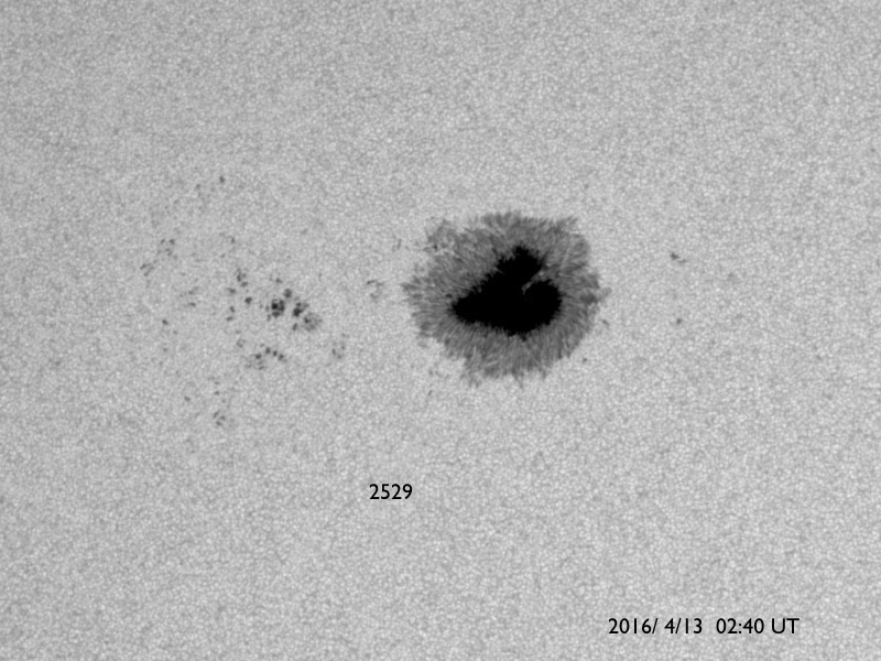 2016/ 4/13 12:43 更新 今朝より高速の太陽風が到来し、磁気圏の活動も強まっています。 担当 篠原 2529黒点群は、大きい姿を保っています。 今日の鹿児島は天気が悪いため、確認することはできませんが、 日食グラスを使って肉眼で見つけることができると思います。 今日の拡大写真では、黒点の右側の黒い部分に細い筋が入り、 左側が尖ってきたたため、斜めを向いたハート型に見えています。 フレアの発生は、昨夕にC1.8の小規模フレアが起きた程度で、 少なくなっているようです。 太陽風は、昨日より、400km/秒と平均的な速度が続いていましたが、 今朝から上昇を始め、現在は560km/秒の高速風になっています。 コロナホールの影響がやって来たようです。 太陽風の磁場強度は、速度の変化が始まる頃に、 15nTまで強まりましたが、その後一段下がって、 現在は8nTとやや強まっているくらいです。 磁場の南北成分は、南寄りに変化が続いています。 速度が高まった頃は、-10nTに達する南向きの変化も発生しました。 このため、AE指数のグラフは変化が強まって、 1000nTに達する変化が3回ほど発生しています。 極域ではオーロラがにぎやかに見えているのではないでしょうか。 ![]() 2529黒点群の拡大写真。SDO衛星。 (c) SDO (NASA)、作図:宇宙天気ニュース ![]() SDO衛星のAIA193カメラによる太陽コロナの様子 (c) SDO (NASA) ![]() SDO衛星による太陽の可視光写真。マウスの矢印を写真に重ねると、黒点番号付きの写真に切り替わります。 (c) SDO (NASA) ![]() GOES衛星の太陽X線データ (c) NOAA/SWPC ![]() ACEが観測した太陽風の磁場(1番上の枠、白線は全体の強度、赤線は南北成分) および、太陽風の密度(3番目の橙線)、速度(4番目の黄線) (c) NOAA/SWPC ![]() リアルタイムAE指数 下段のAEグラフの値が高くなると、オーロラ活動が活発化しています。 (c) 京都大学, NICT ![]() 27日の太陽周期に合わせたデータプロット 太陽が同じ面を地球に向けていた27日前の変化から、今後を予想することができます。 (c) 作図:宇宙天気ニュース