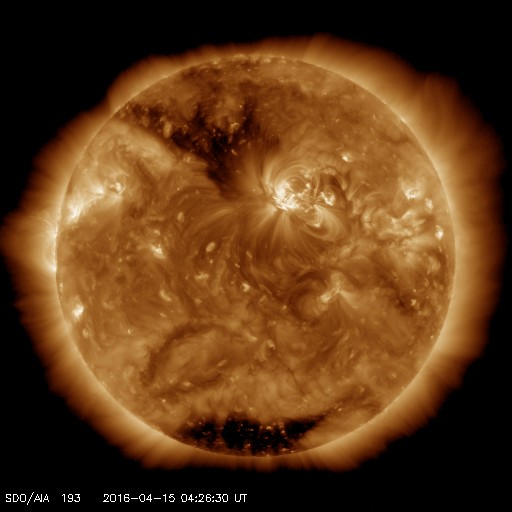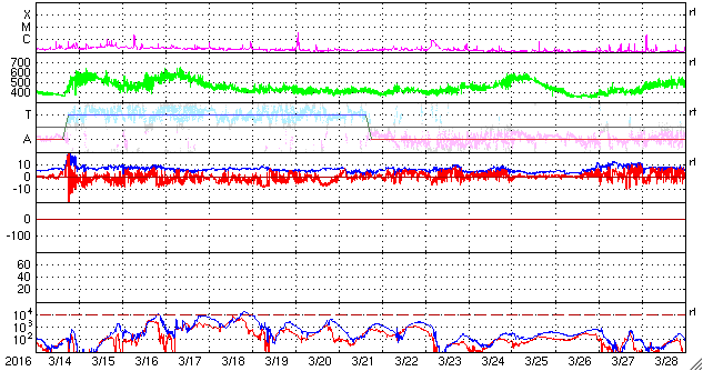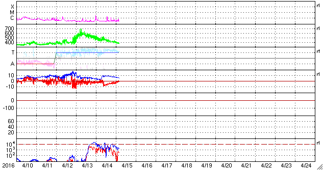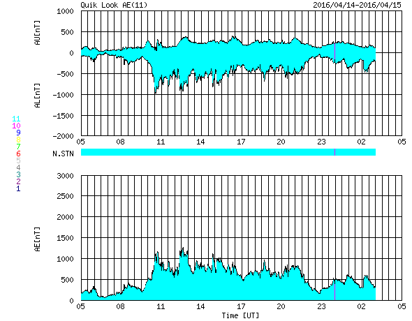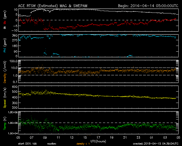 2016/ 4/15 13:40 更新 太陽風磁場の強まりが到来し、磁気圏の活動を高めました。 担当 篠原 昨日の午後、14日16時(世界時14日7時)より、 太陽風磁場の強まりが到来し、 4nTと平均的な値だった磁場強度は、10nTに強まりました。 4月11日、12日のニュースで紹介した、 フィラメント噴出によるCMEの乱れが やって来たのかもしれません。 変化が到来して2時間ほど経った頃から、 磁場の南北成分は南向きに振れて、-8nTに強まりました。 このため、磁気圏の活動も高まって、 AE指数は、1000nTを超える変化が記録されています。 南向きの磁場は、その後ゆっくりと振幅が下がり、 ちょうど0nTに戻ったところです。 この後は、北向きに切り替わっていくかもしれません。 AE指数の変化も、次第に500nT程度へ弱まっていますが、 磁場の変化がこのままであれば、 AE指数も小さくなっていくでしょう。 太陽風の速度は、ゆっくりと低下が続いています。 既に380km/秒まで下がって、やや低速の風になっています。 コロナホールの影響は終わり、 しばらく穏やかに推移しそうです。 太陽は、2529黒点群の大きな姿が続いています。 C1.8、C1.3の小規模フレアを起こしていて、 弱い活動は続いています。