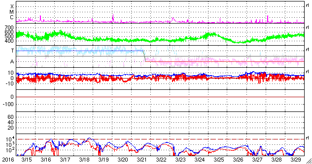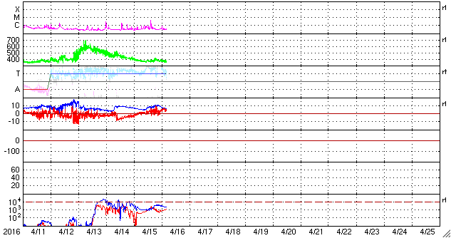 2016/ 4/13 12:43 今朝より高速の太陽風が到来し、磁気圏の活動も強まっています。