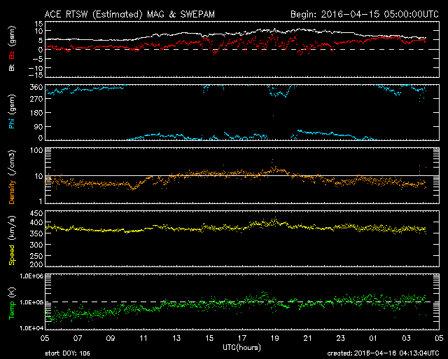 2016/ 4/11 10:12 太陽風はやや低速です。カナダのオーロラをどうぞ。