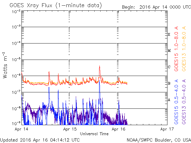 2016/ 4/12 12:19 C1の小さいフレアが数回発生しています。太陽風は低速です。