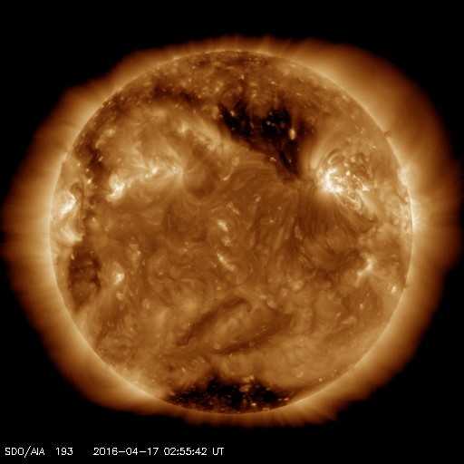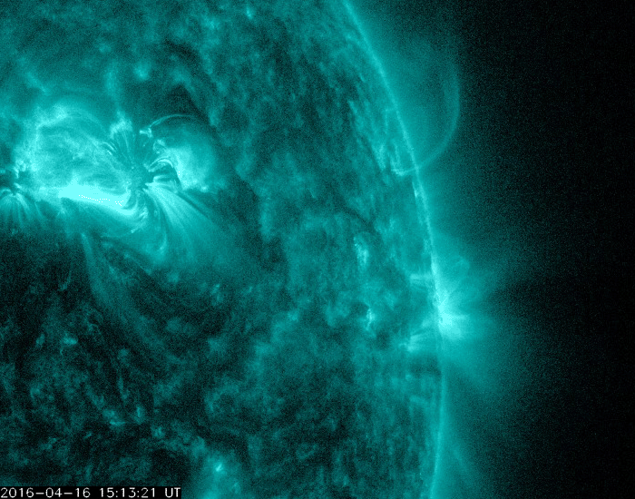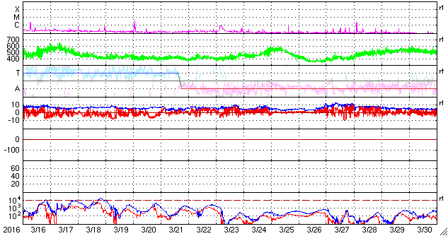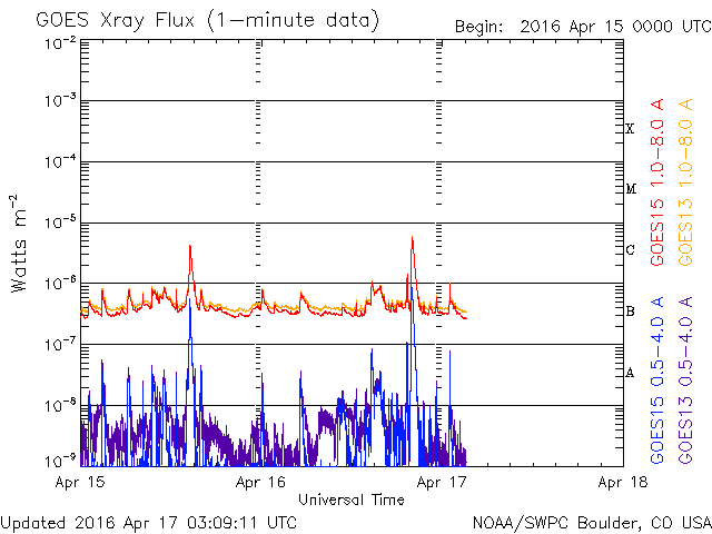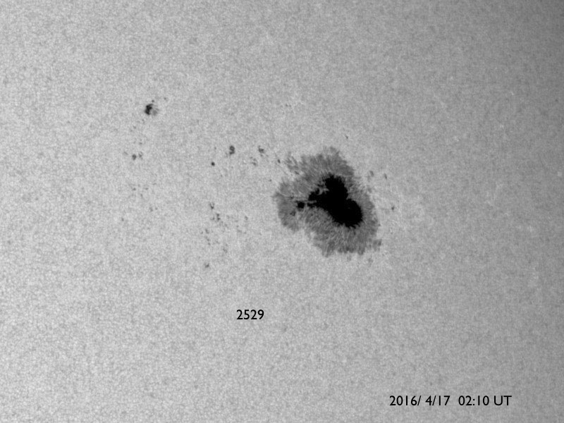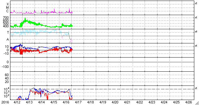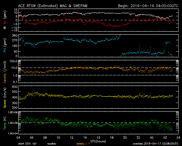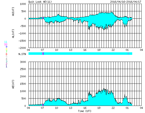 2016/ 4/17 12:09 更新 C5.8の小規模フレアが発生しました。太陽風磁場が南寄りになり、磁気圏活動が高まっています。 担当 篠原 2529黒点群で、今朝、17日4時半(世界時16日19時半)に、 C5.8とやや大きい小規模フレアが発生しました。 昨日のC4.1から、約1日後の発生です。 フレアの様子を、SDO衛星AIA131と304の動画で紹介します。 このくらいの規模になると、動画も目立つようになってきます。 AIA304(赤色の写真)では、 右下に向かってコロナのガスが噴き出す様子も見えていて、 CMEとなっているようです。 地球に対して横に向かっているので、影響はないでしょう。 2529群では、この他にも小さい活動が発生しています。 この後も、Cクラスのフレアが発生するかもしれません。 東端から現れた新しい黒点には、 2532群と番号が付きました。 太陽風は、400km/秒に速度が少し上がり、 平均的な速さに戻っています。 磁場強度は、5nTから10nTへ上がり、その後5nTへ戻るという、 昨日のACEのデータと同じような推移をしています。 しかし、南北成分の傾向が南寄りに変わって、 -5nTを超える変化も到来しています。 このため、磁気圏の活動は高まりを見せ、 AE指数は、500nTから1000nTに達する、 活発な変化になっています。 昨日の静かなAE指数のグラフと対照的です。 27日周期の図を見ると、 セクターの切り替わりも到来しています。 この後太陽風の磁場がどのような変化をするのか、 オーロラ活動の推移とともに注目してください。