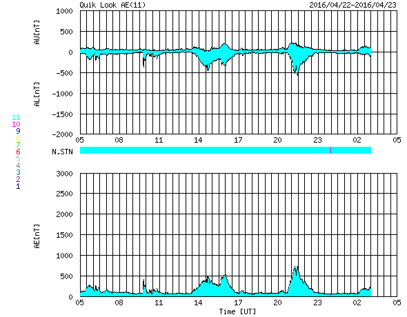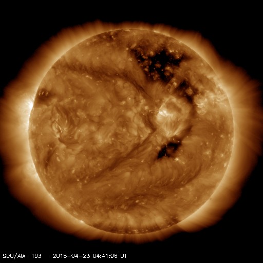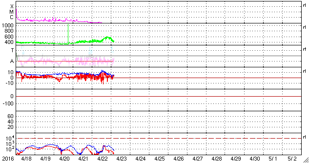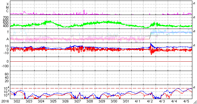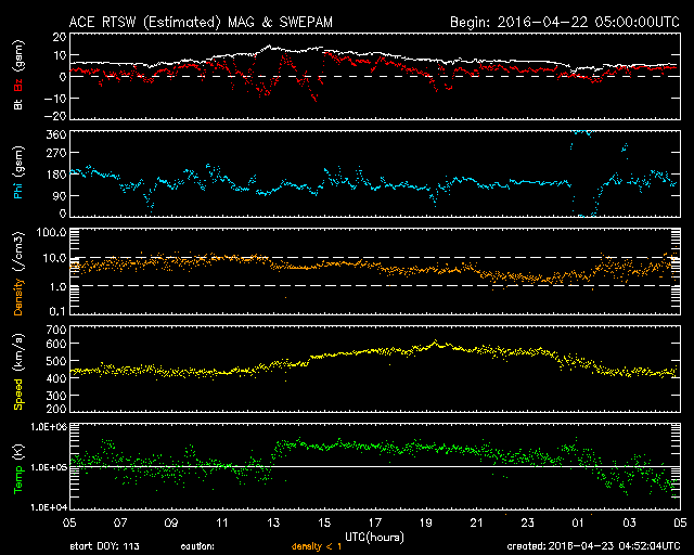 2016/ 4/23 13:52 更新 太陽風の変化がやって来て、600km/秒近くまで速度が高まりました。 担当 篠原 昨夜、22日21時(世界時22日13時)に、 太陽風の磁場強度が15nT近くまで強まりました。 速度も、その頃から高まり始めて、 今朝、23日5時(世界時22日20時)頃には、 600km/秒近くまで高まりました。 太陽風の急な高まりでしたが、変化は短い時間で終わりそうで、 現在、既に磁場強度は5nTに下がり、 速度も430km/秒に戻っています。 磁気圏への影響度を決める、太陽風磁場の南北成分は、 基本的には、北向きで推移していたのですが、 磁場が強まった頃に、一時的に南向きに振れて、 磁気圏の活動を高めています。 AE指数では、500〜700nTの中規模の変化が2回起きています。 現在は、磁場が北向きになっているため、 磁気圏は静かになっているようです。 コロナホールの影響は、 今回の変化とは別にやって来るのではないかと思いますが、 今日以降、太陽風はどの様に推移するでしょうか。 太陽は、X線グラフの強度がゆっくりと下がり、 変化も全くない状態です。 黒点は、2533群がぽつんと見えているだけです。 しかし、SDO衛星のAIA131などの動画を見ていると、 東端の向こう側に活動的な領域があるようです。 これから黒点が姿を現すかもしれません。 ![]() SDO衛星のAIA193カメラによる太陽コロナの様子 (c) SDO (NASA) ![]() SDO衛星による太陽の可視光写真。マウスの矢印を写真に重ねると、黒点番号付きの写真に切り替わります。 (c) SDO (NASA) ![]() ACEが観測した太陽風の磁場(1番上の枠、白線は全体の強度、赤線は南北成分) および、太陽風の密度(3番目の橙線)、速度(4番目の黄線) (c) NOAA/SWPC ![]() リアルタイムAE指数 下段のAEグラフの値が高くなると、オーロラ活動が活発化しています。 (c) 京都大学, NICT ![]() 27日の太陽周期に合わせたデータプロット 太陽が同じ面を地球に向けていた27日前の変化から、今後を予想することができます。 (c) 作図:宇宙天気ニュース