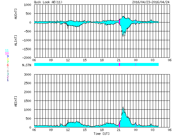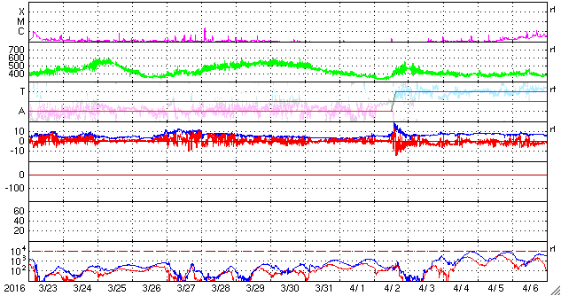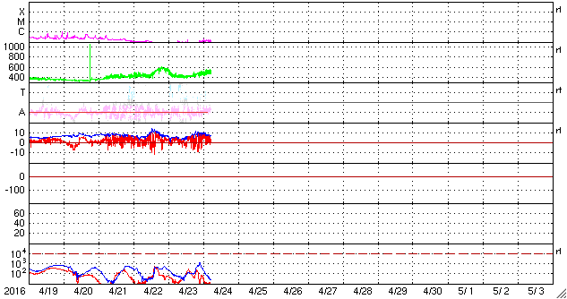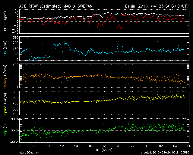 2016/ 4/24 14:26 更新 コロナホールの影響が始まり、太陽風は500km/秒の高速風になっています。 担当 篠原 昨夜から今朝にかけて、再び太陽風の高まりが到来しました。 磁場強度は、24日3時(世界時23日18時)頃に10nTへ強まり、 速度も、追いかけるように上昇して、 今朝、24日8時(世界時23日23時)頃に、 500km/秒に高まりました。 現在も、太陽風の速度は500km/秒と高速の状態です。 磁場強度は、7nT程度にやや下がっています。 コロナホールの影響が始まったようです。 27日周期の図を見ると、太陽風速度の変化の始まりは、 前周期(3月27〜28日)と同じタイミングになっています。 前周期は、3月31日にかけて、およそ4日間高速風が続きました。 今回はどうなるでしょうか。 太陽風磁場の南北成分は、北寄りに推移していますが、 一時的に南向きに振れる変化も来ていて、 AE指数では、1000nTに達する大きな変化も発生しています。 しかし、このまま磁場の北寄りの状態が続くと、 オーロラの活動はあまり高まらないでしょう。 太陽では、2532黒点群の黒点が、 再び見えるようになっています。 東端にも、とても小さい黒点が発生しているようですが、 掲載している可視光写真では、ほとんど分かりません。 ![]() SDO衛星のAIA193カメラによる太陽コロナの様子 (c) SDO (NASA) ![]() SDO衛星による太陽の可視光写真。マウスの矢印を写真に重ねると、黒点番号付きの写真に切り替わります。 (c) SDO (NASA) ![]() ACEが観測した太陽風の磁場(1番上の枠、白線は全体の強度、赤線は南北成分) および、太陽風の密度(3番目の橙線)、速度(4番目の黄線) (c) NOAA/SWPC ![]() リアルタイムAE指数 下段のAEグラフの値が高くなると、オーロラ活動が活発化しています。 (c) 京都大学, NICT ![]() 27日の太陽周期に合わせたデータプロット 太陽が同じ面を地球に向けていた27日前の変化から、今後を予想することができます。 (c) 作図:宇宙天気ニュース