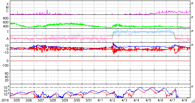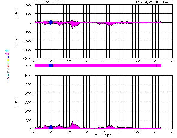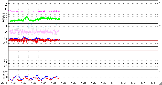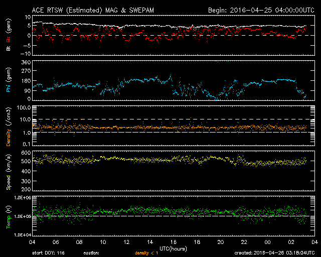 2016/ 4/26 12:19 更新 高速の太陽風が続いています。磁気圏は比較的静かです。 担当 篠原 太陽風は、500km/秒から480km/秒へ 少し下がりかけていますが、高速の風が続いています。 磁場強度も、6nTから4nTへ少し下がり、 高速風領域は後半に入ってきたようです。 太陽風磁場の南北成分は、 0nT付近で小さく南に向いたり、北に向いたりしています。 磁気圏への影響も小さくなっていて、 AE指数の変化は、小さい高まりが時々見えている程度です。 27日周期の図を参考にすると、 高速の太陽風が続くのは、明日くらいまでになりそうです。 磁場の傾向がこのままであれば、 磁気圏の活動はあまり高まらないまま過ぎていきそうです。 太陽は、2535黒点群の向こうの東端から、 新しい黒点が現れています。 今のところ、Bクラスの小さい活動を起こしている程度です。